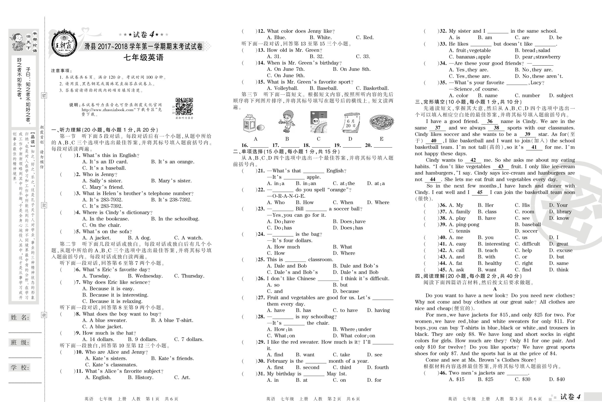 2017-2018学年第一学期安阳市滑县七年级英语试卷(人教版)【4】