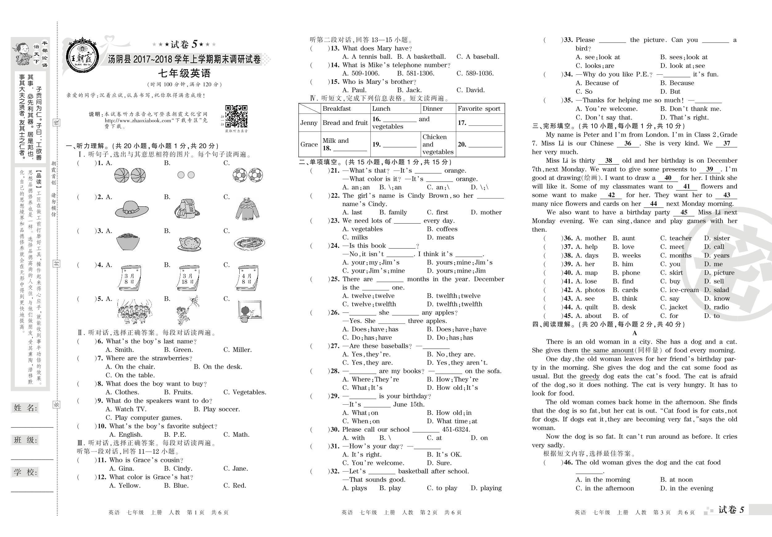 2017-2018学年第一学期安阳市汤阴县七年级英语试卷(人教版)【5】