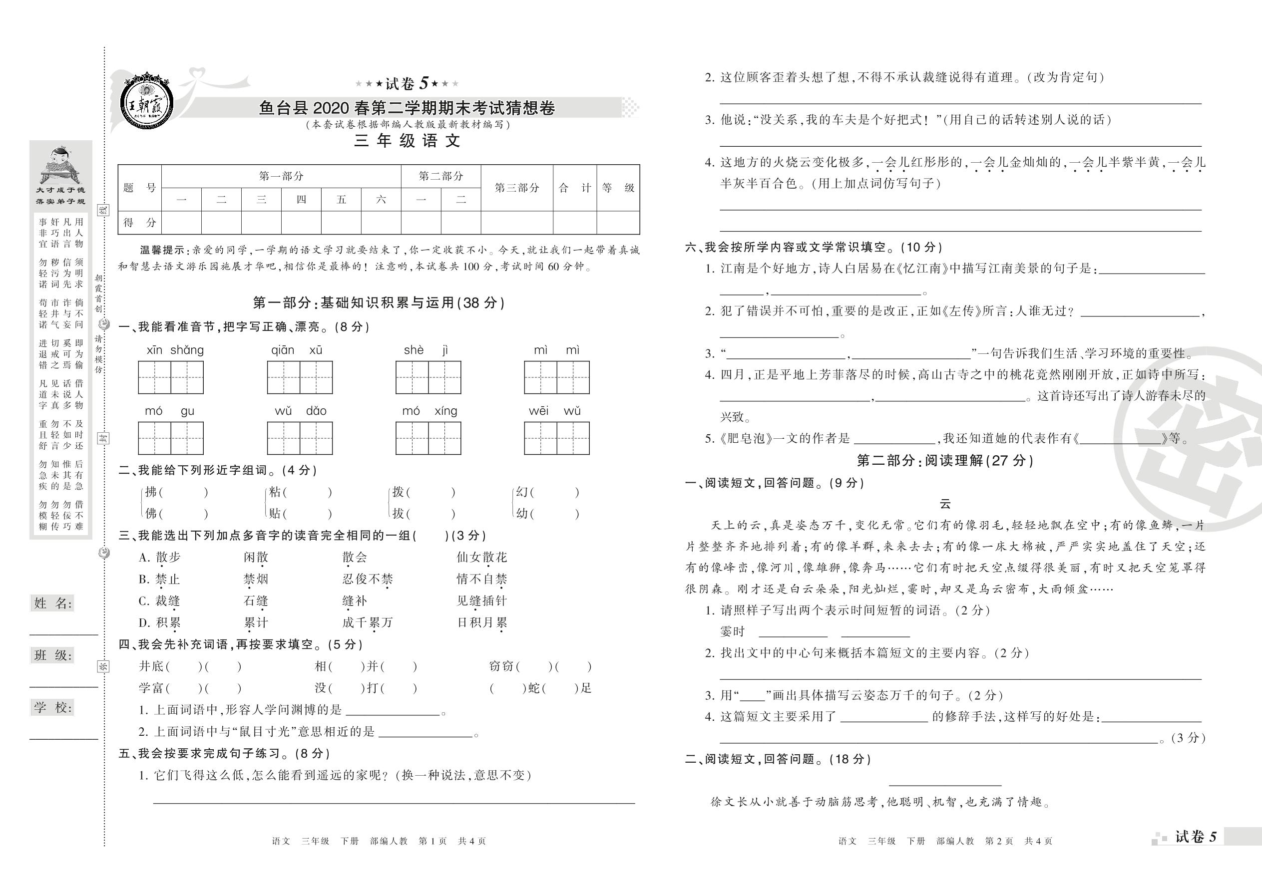 2018-2019学年第二学期济宁市鱼台县猜想卷三年级语文试卷(人教版)【5】