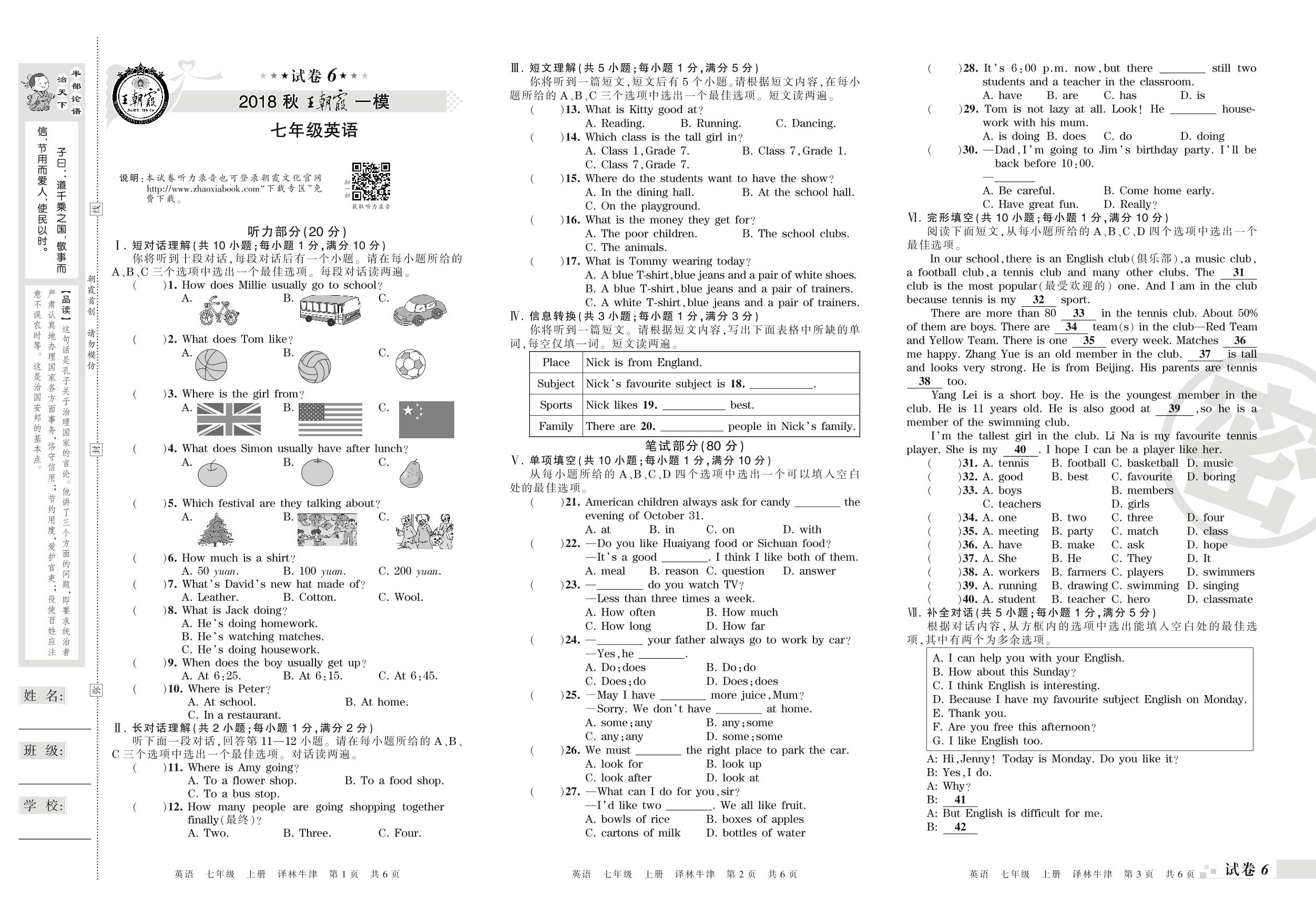 王朝霞期末模拟卷七年级上册英语(译林版)_R210807215543【6】