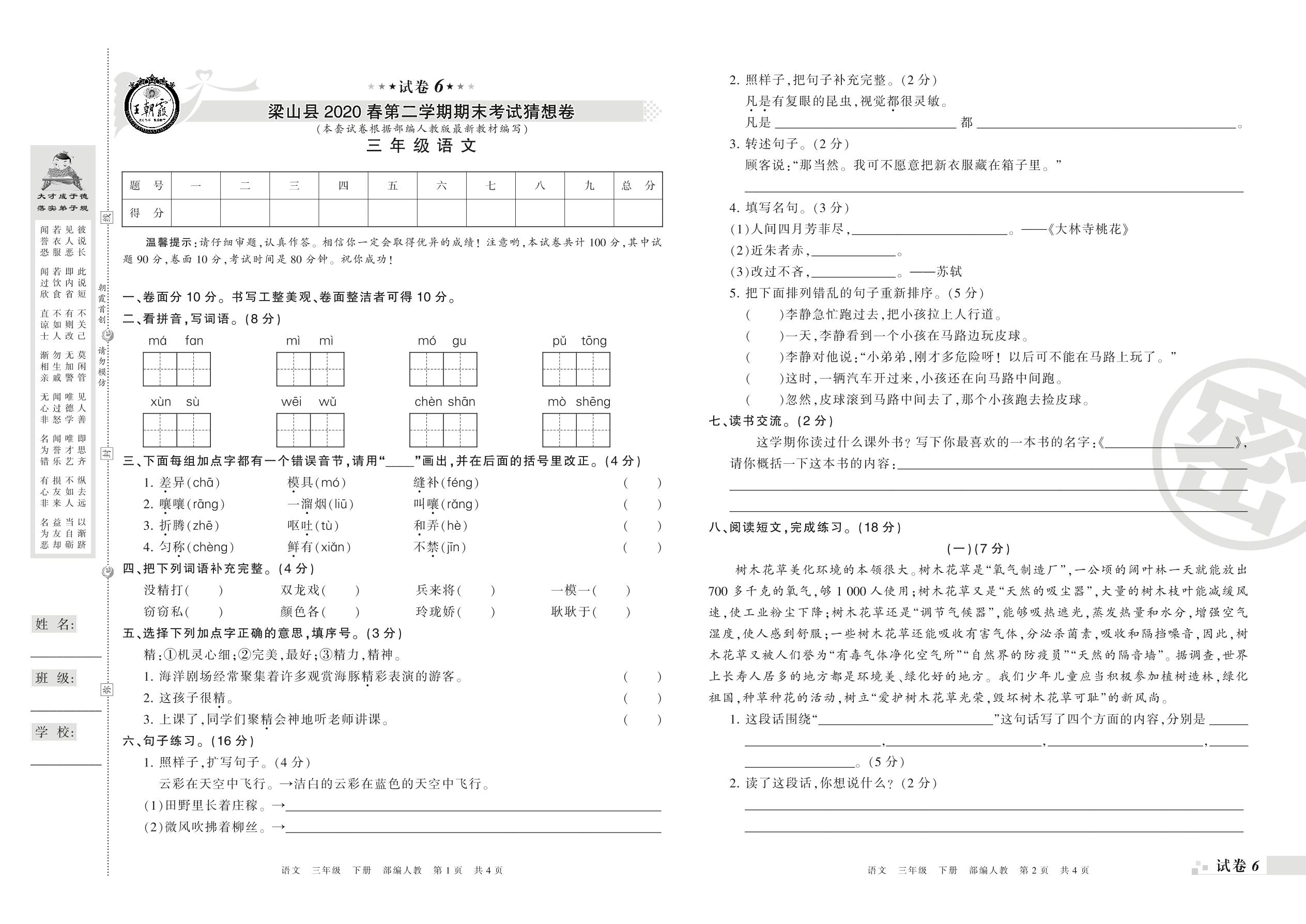 2018-2019学年第二学期济宁市梁山县猜想卷三年级语文试卷(人教版)【6】