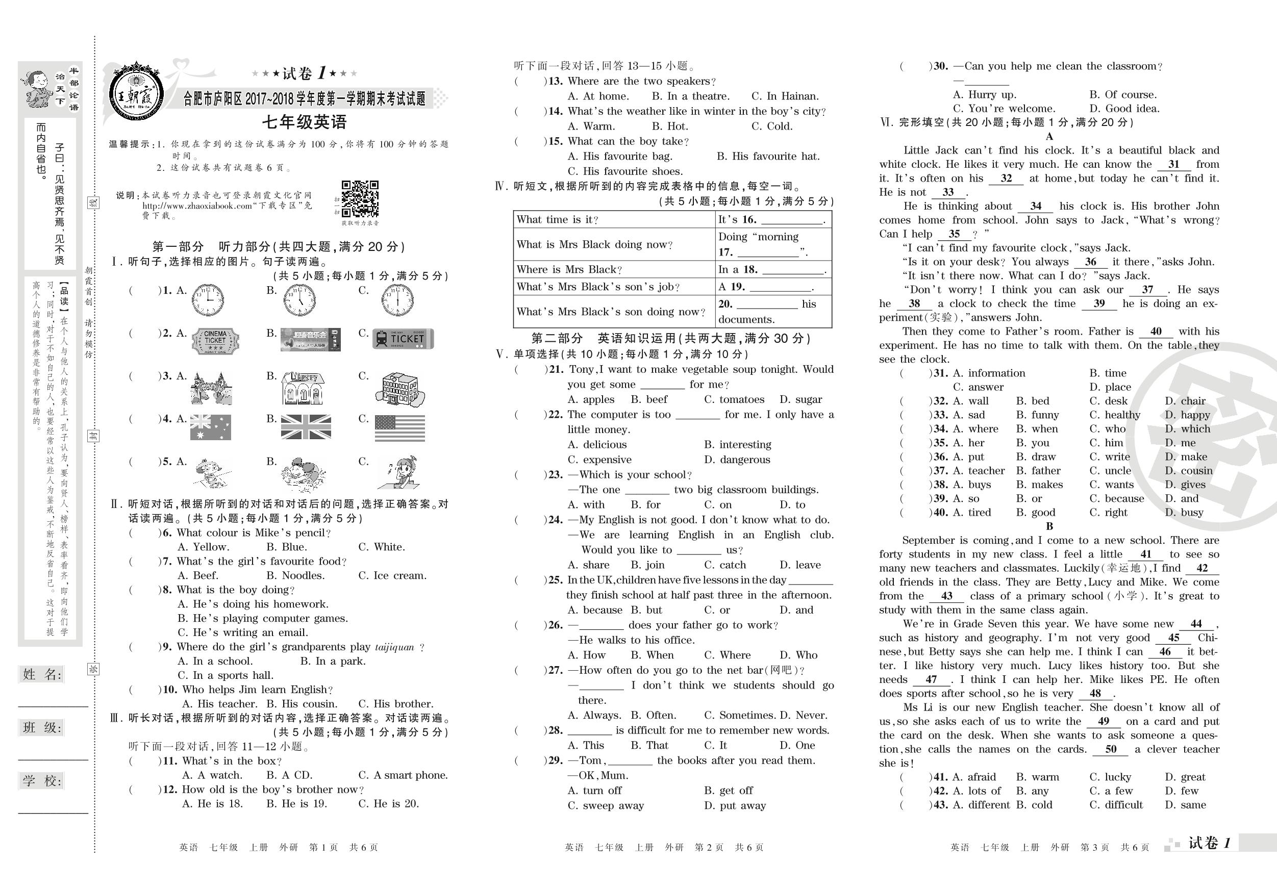 2017-2018学年第一学期合肥市庐阳区七年级英语试卷(外研版)【1】