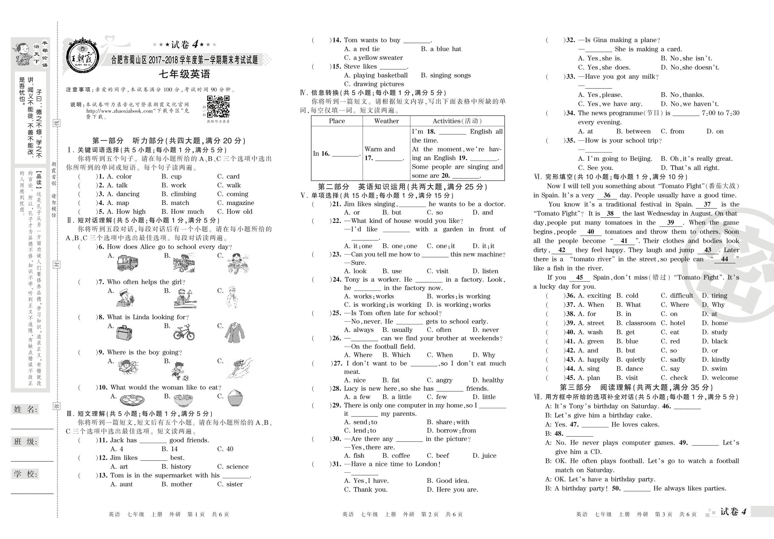 2017-2018学年第一学期合肥市蜀山区七年级英语试卷(外研版)【4】