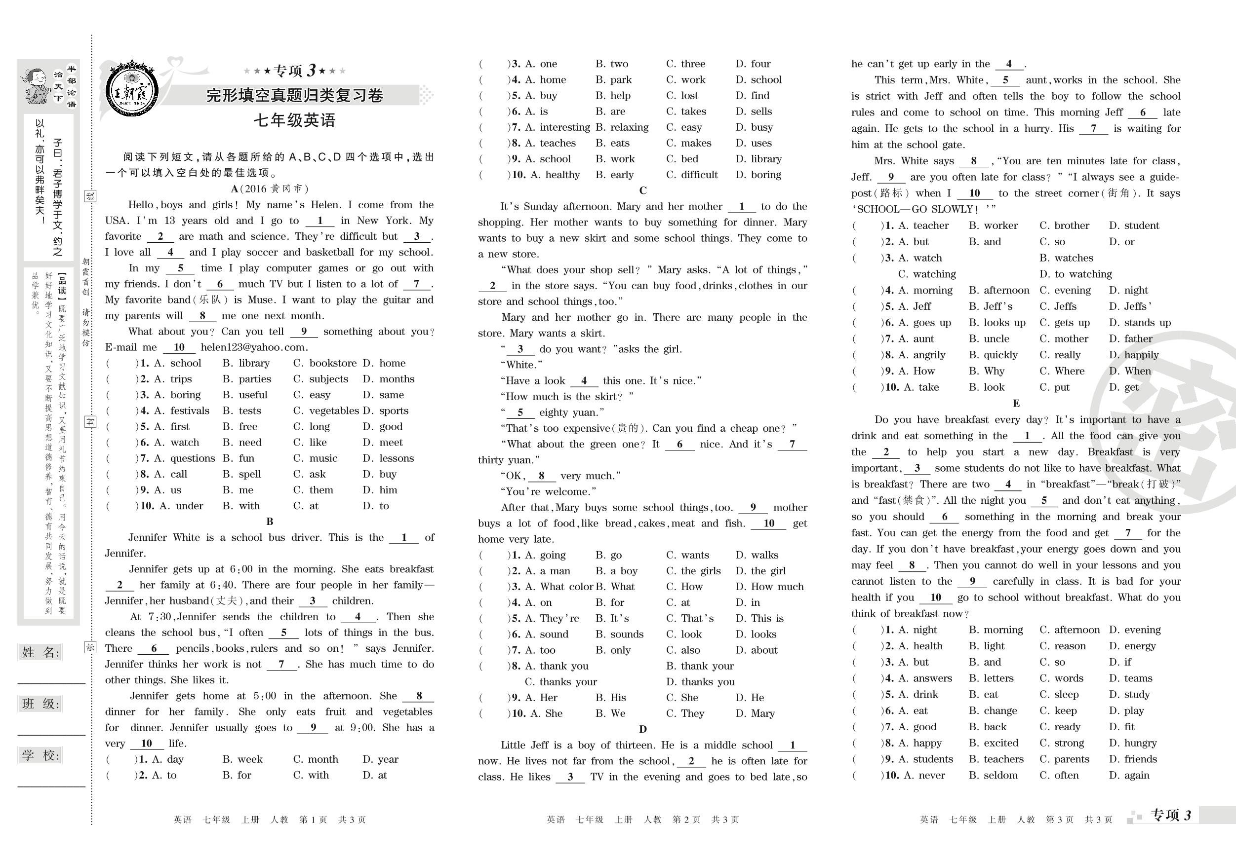 王朝霞期末专项卷——完形填空、选择型阅读真题归类复习卷七年级上册英语(人教版)_R210807220010【0】
