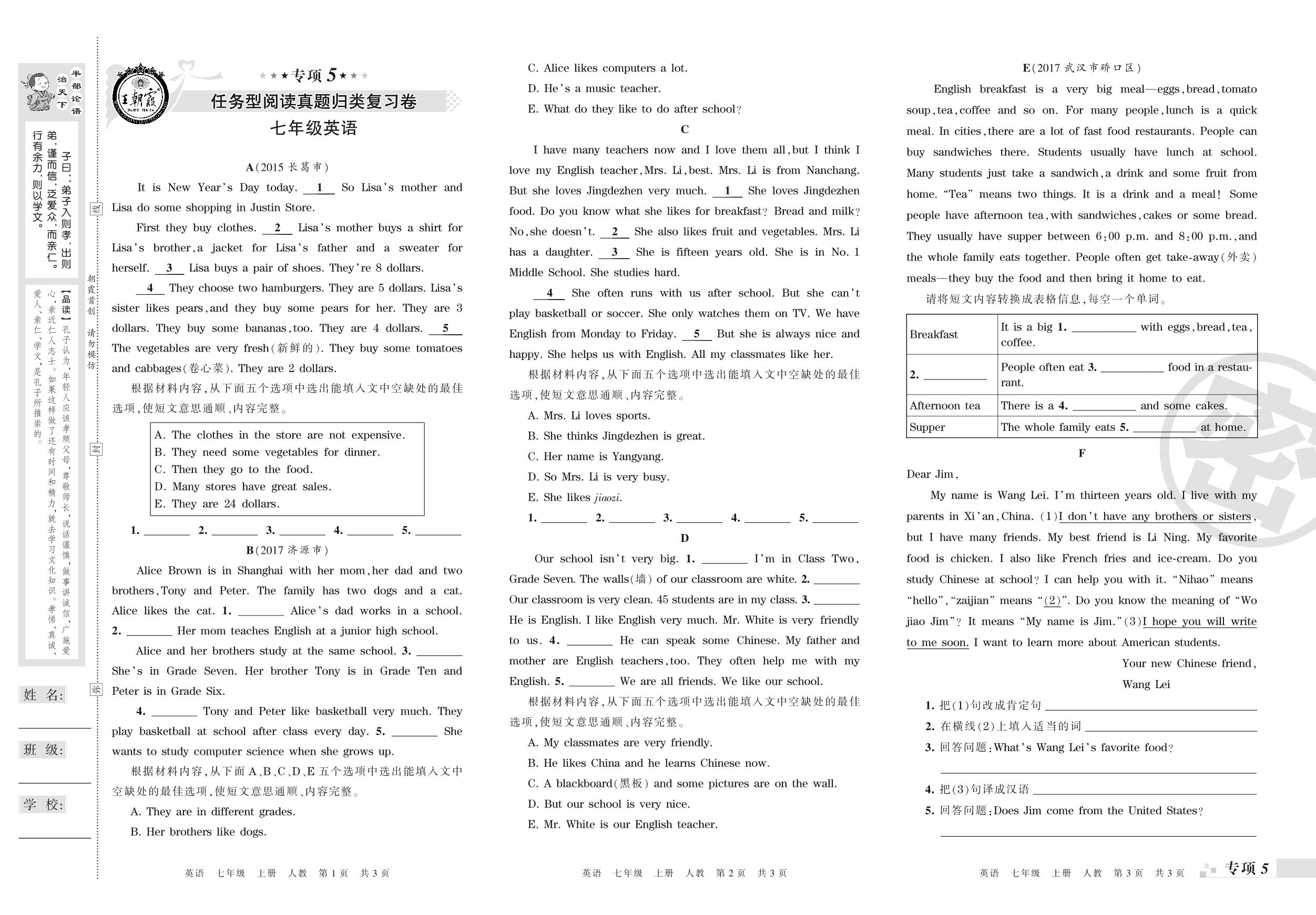 王朝霞期末专项卷——任务型阅读、词语运用真题归类复习卷七年级上册英语(人教版)_R210807220016【0】