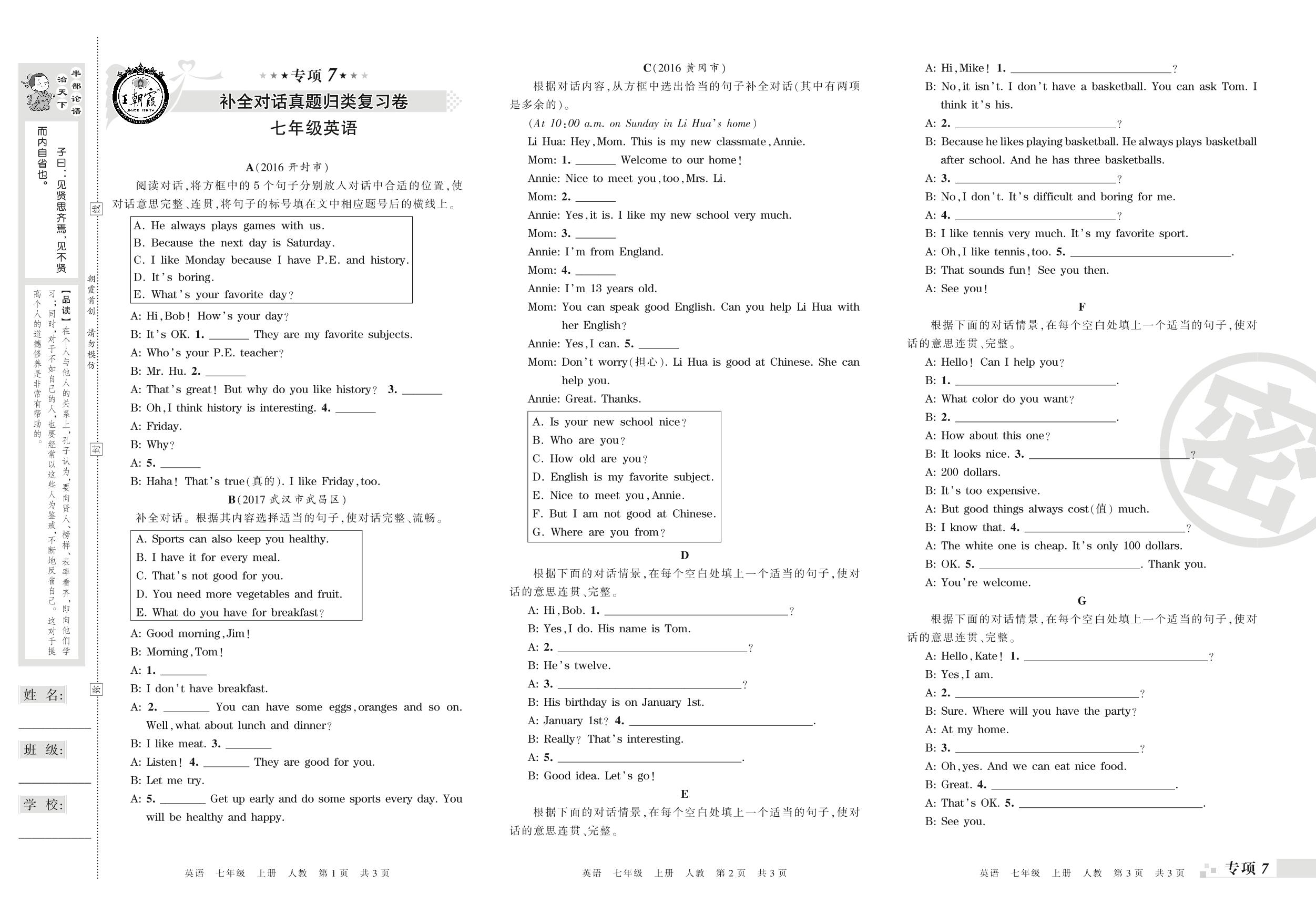 王朝霞期末专项卷——补全对话、书面表达真题归类复习卷七年级上册英语(人教版)_R210807220021【0】
