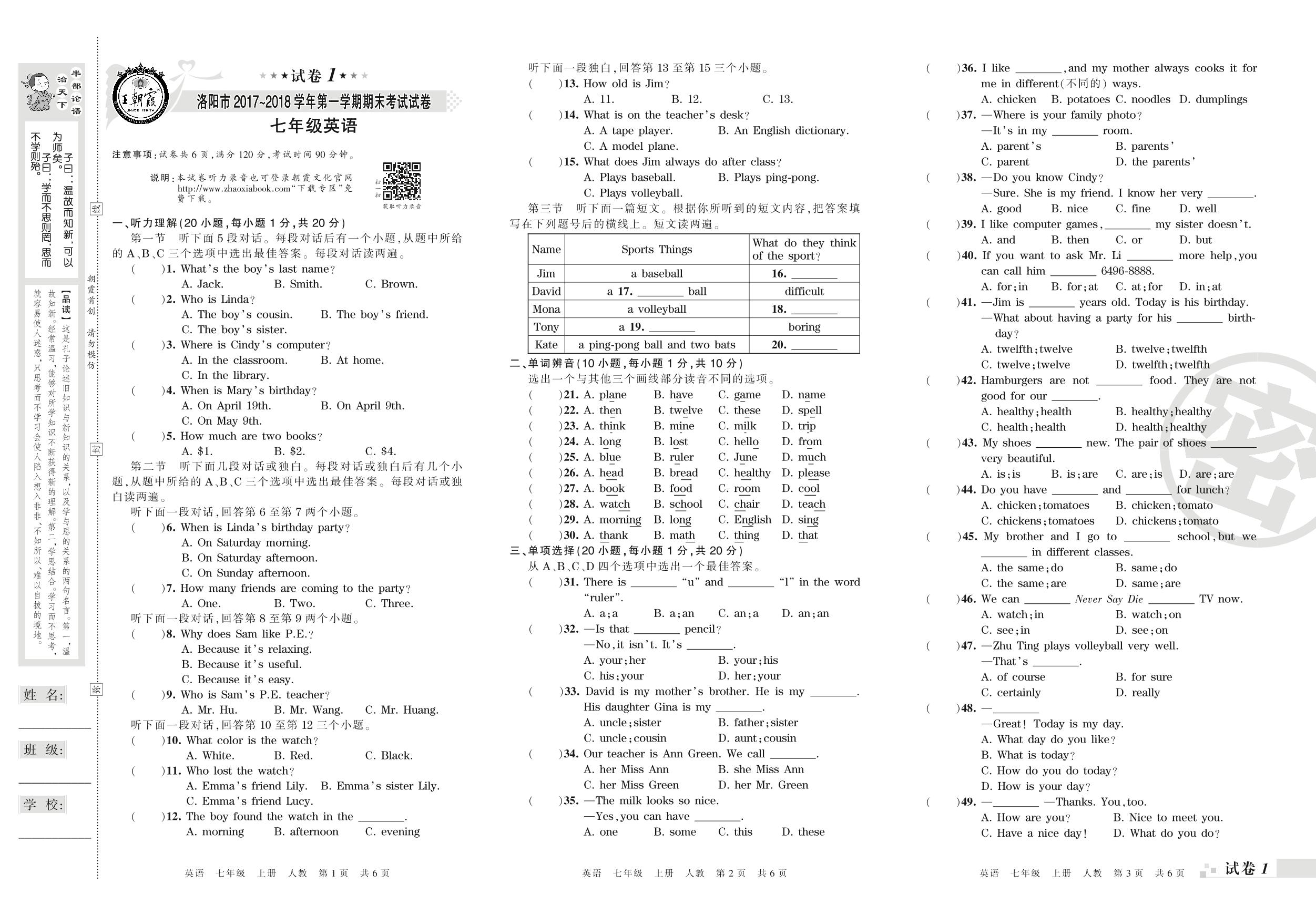 2017-2018学年第一学期洛阳市七年级英语试卷(人教版)【1】