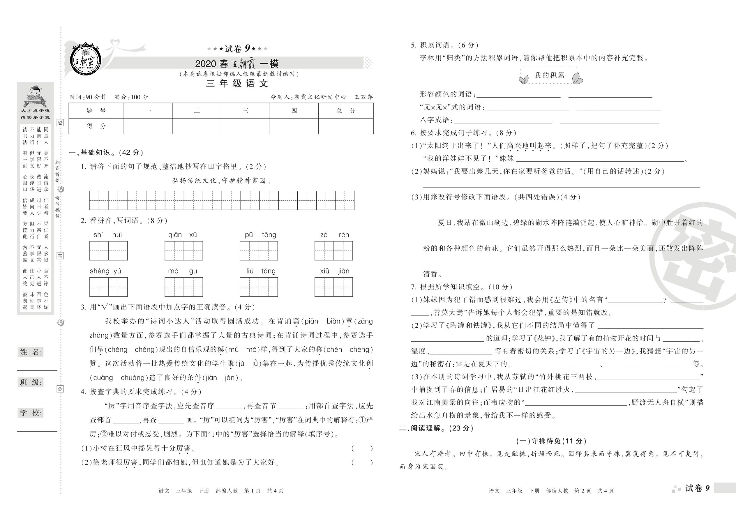 王朝霞期末模拟卷三年级下册语文(人教版)_R21080190543【9】