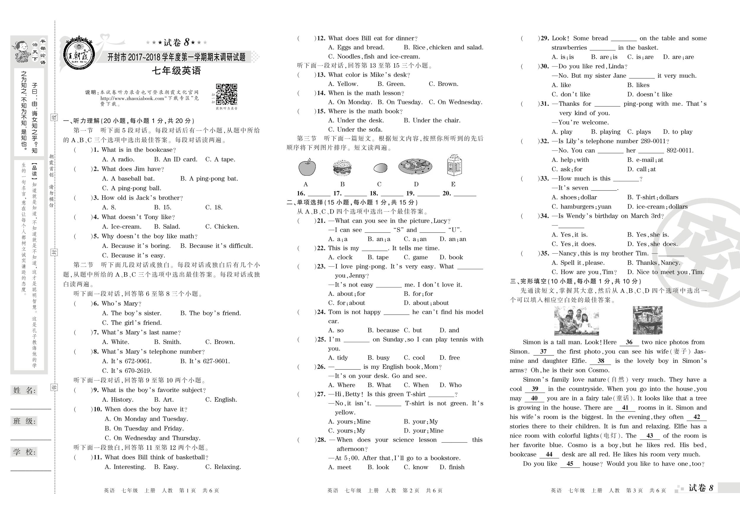 2017-2018学年第一学期开封市七年级英语试卷(人教版)【8】