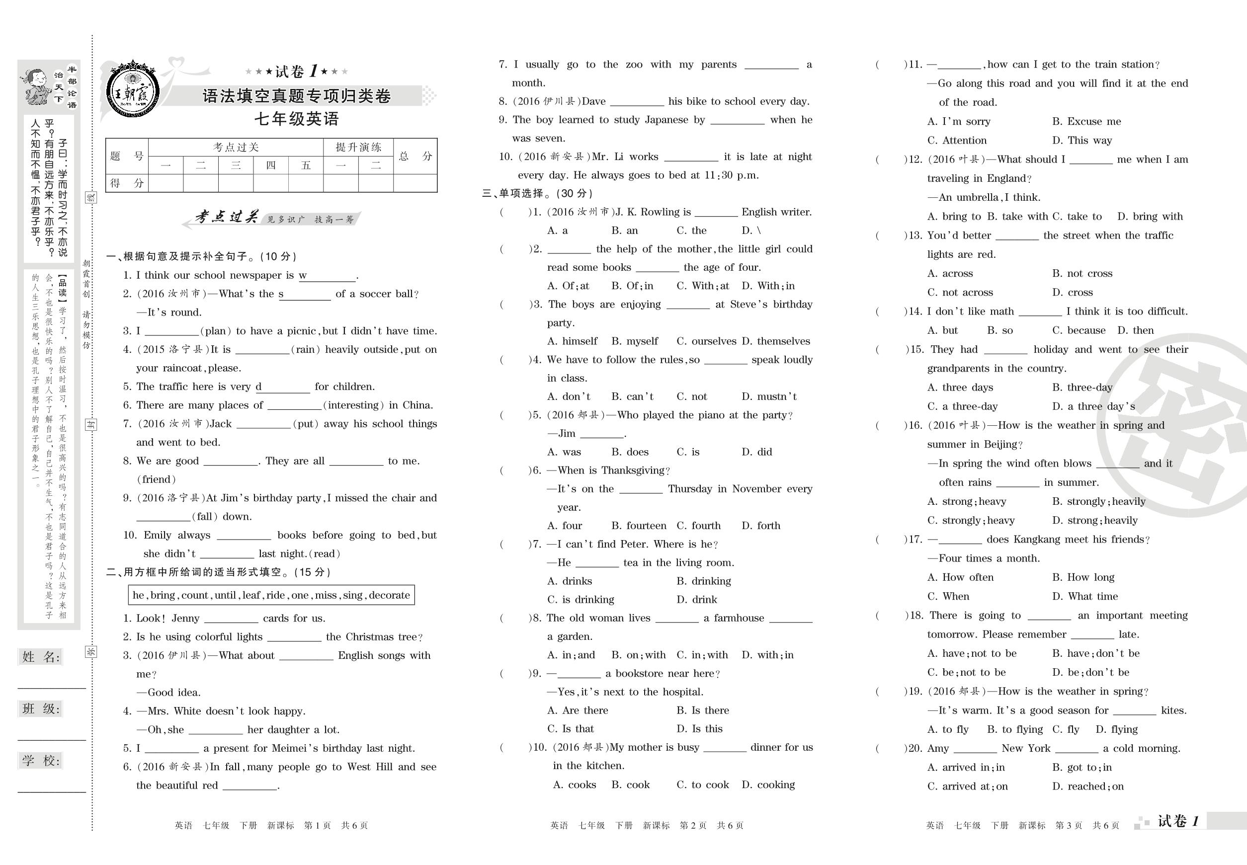 七年级英语新课标版下册专项卷