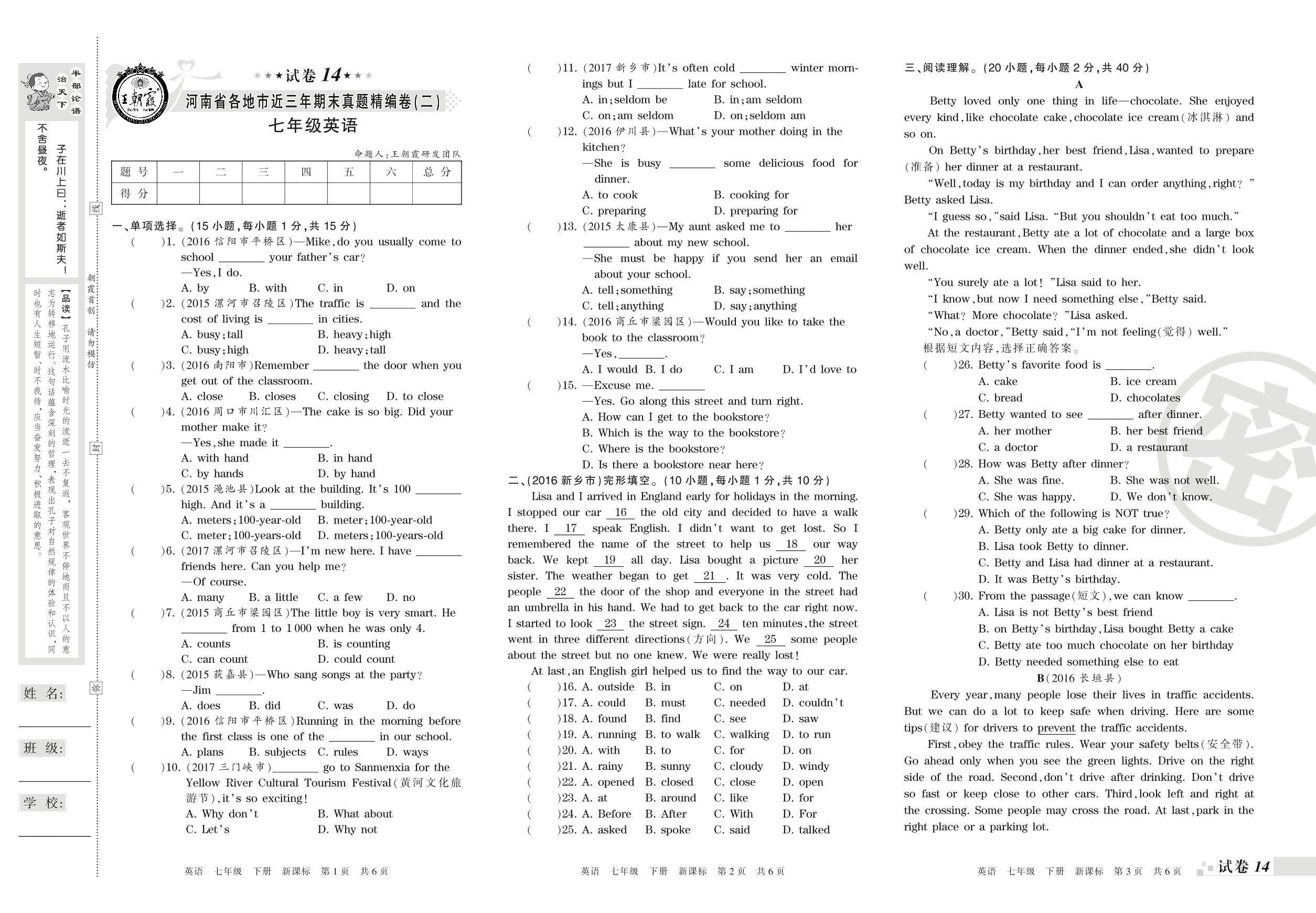 河南省各地市近三年期末真题精编卷(二)七年级下册英语(新课版)【14】