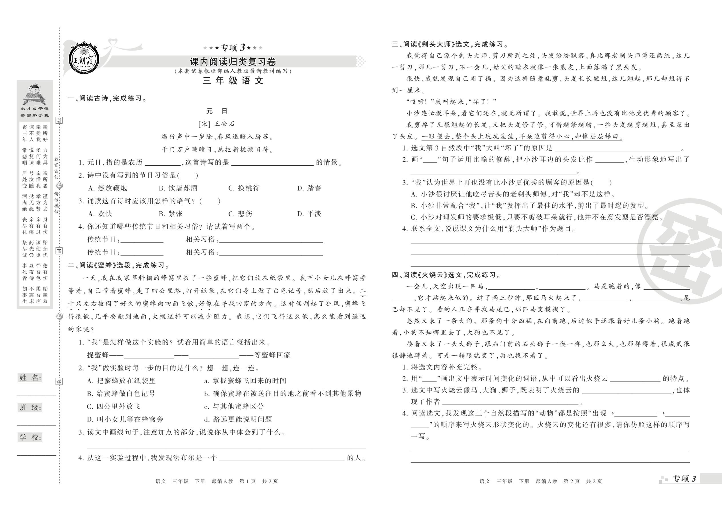 王朝霞期末专项卷——课内阅读、课外阅读真题归类复习卷三年级下册语文(人教版)_R21080190605【0】