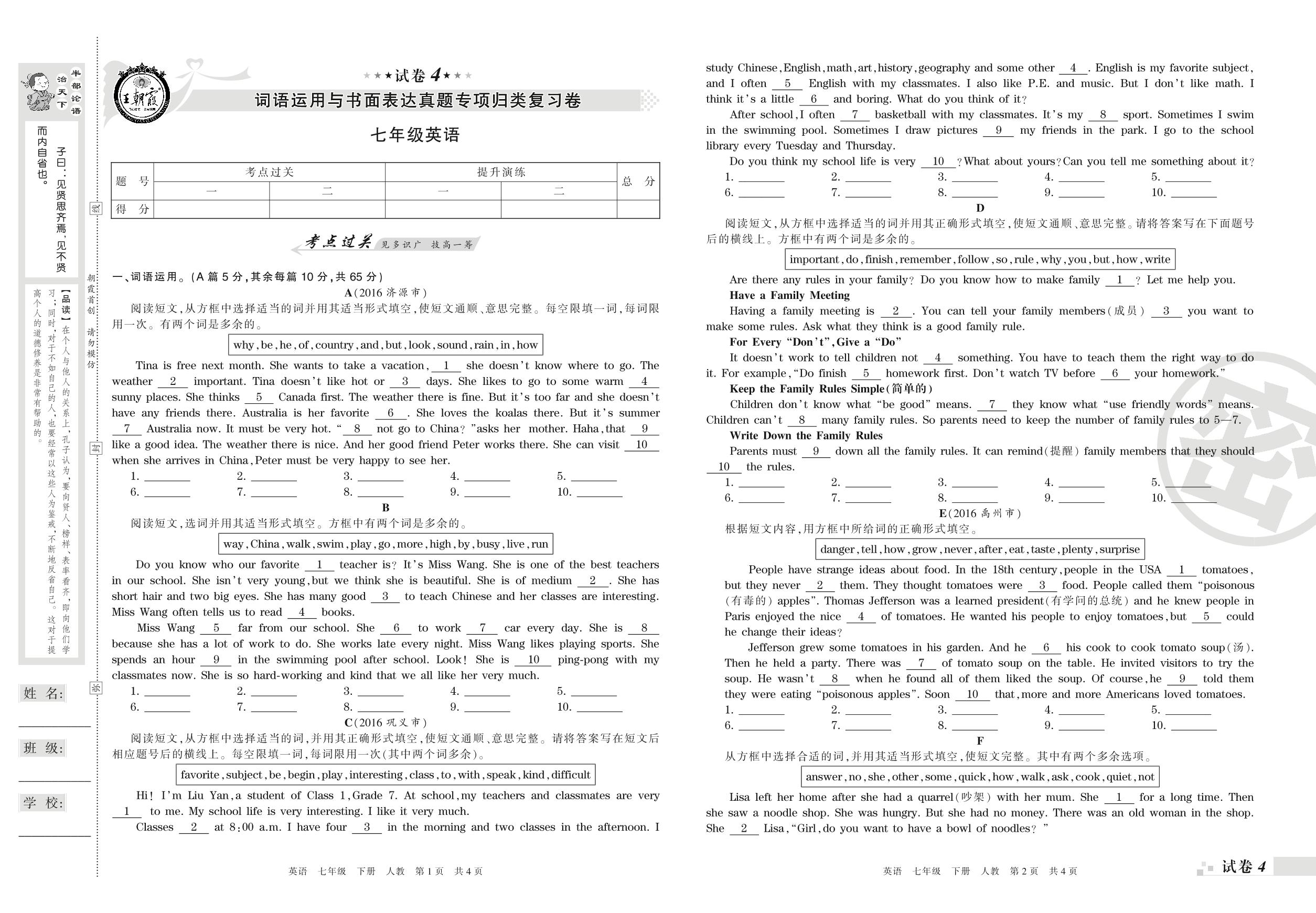 王朝霞期末专项卷——词语运用与书面表达真题专项归类复习卷七年级下册英语(人教版)【4】