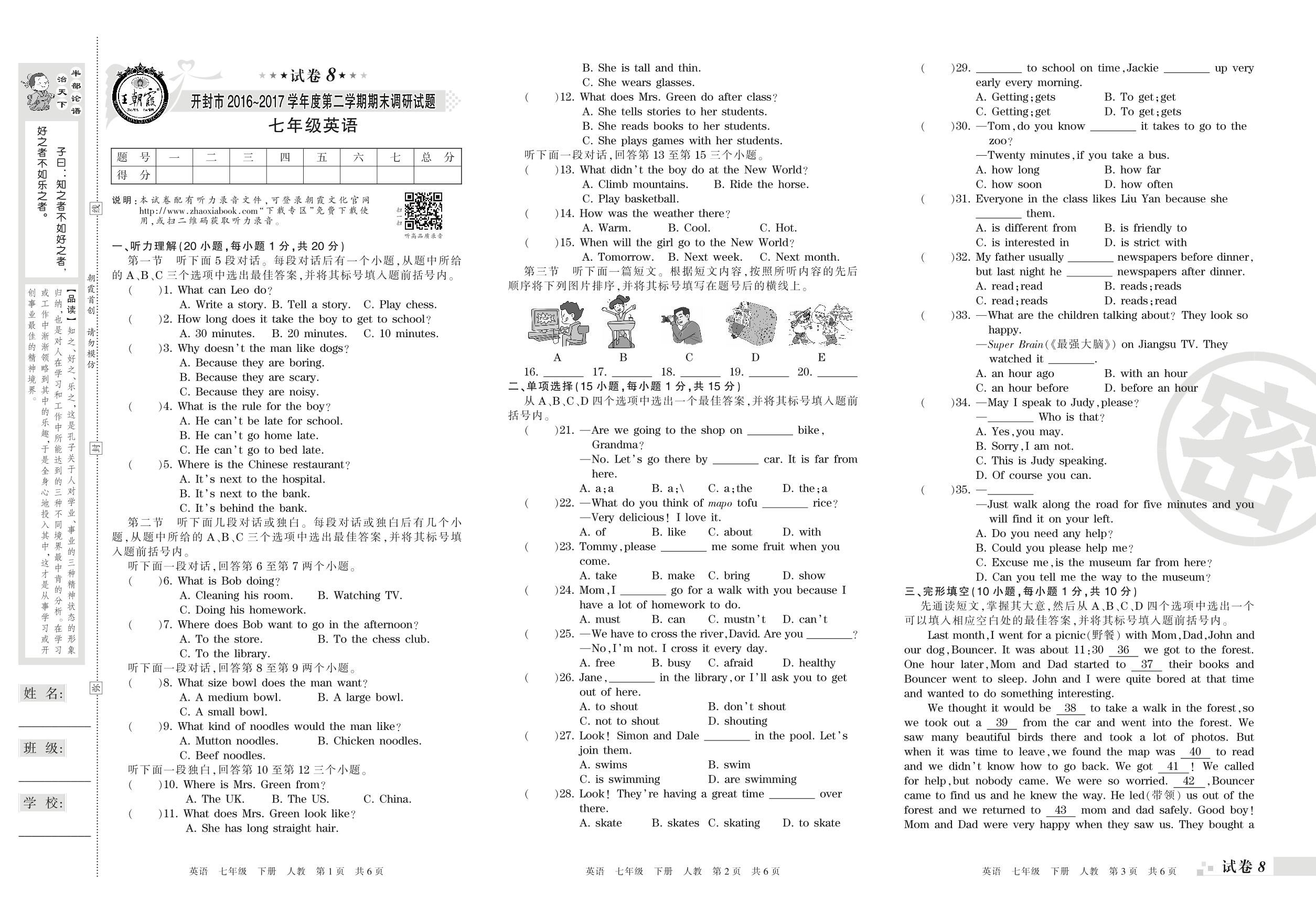 2016-2017学年第二学期开封市七年级英语试卷(人教版)【8】