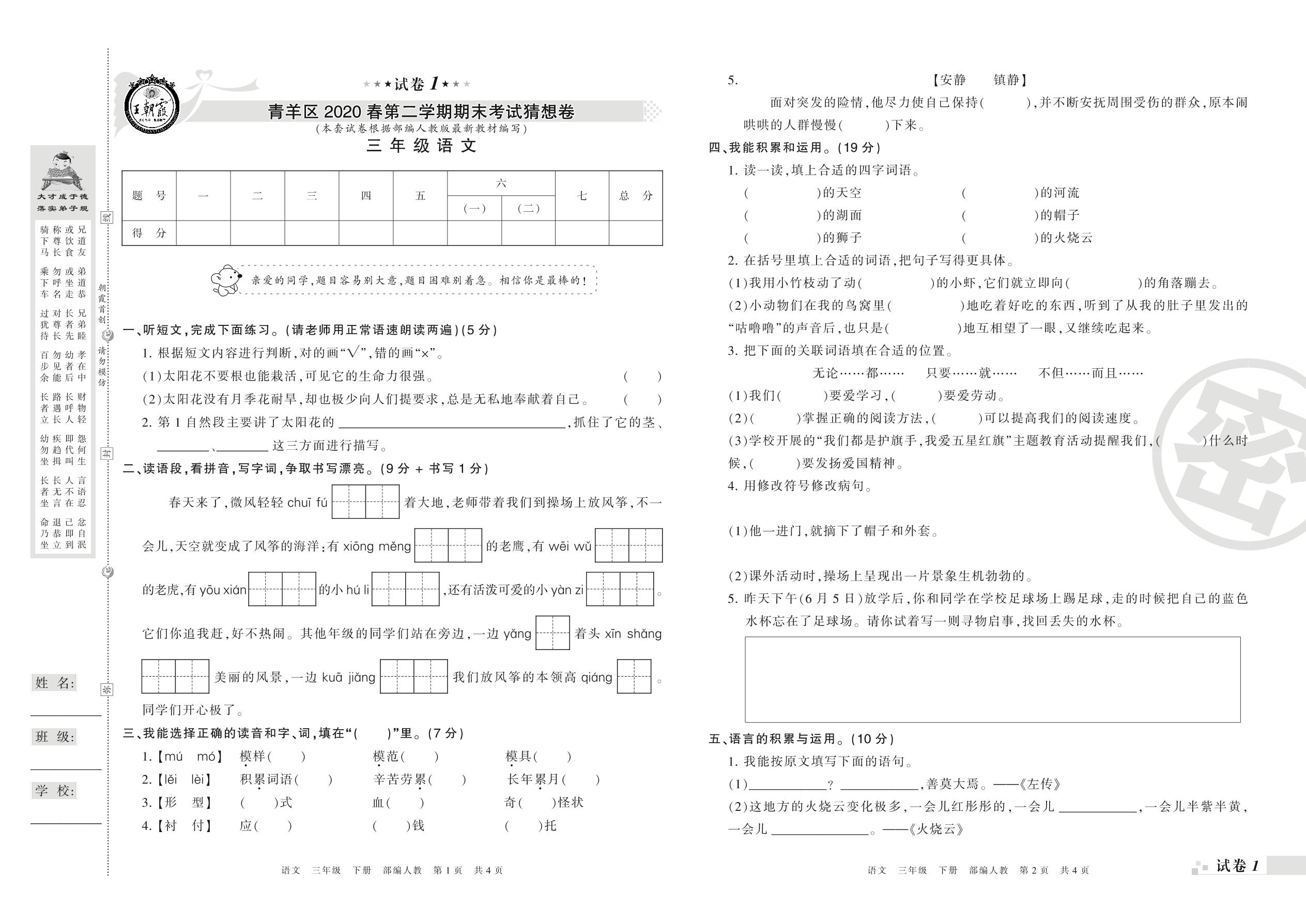 2018-2019学年第二学期成都市青羊区猜想卷三年级语文试卷(人教版)【1】
