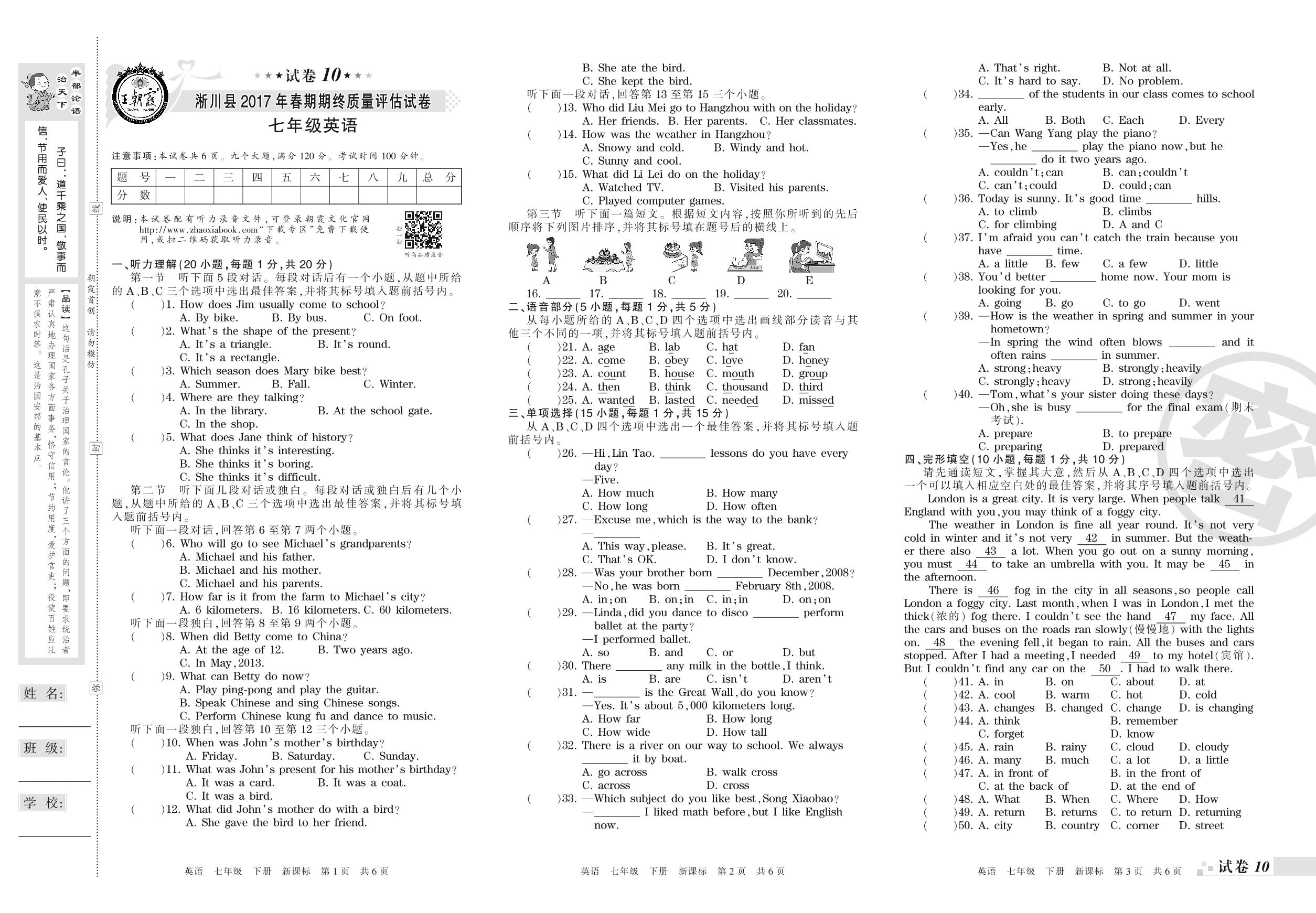 2016-2017学年第二学期南阳市淅川县七年级英语试卷(新课版)【10】