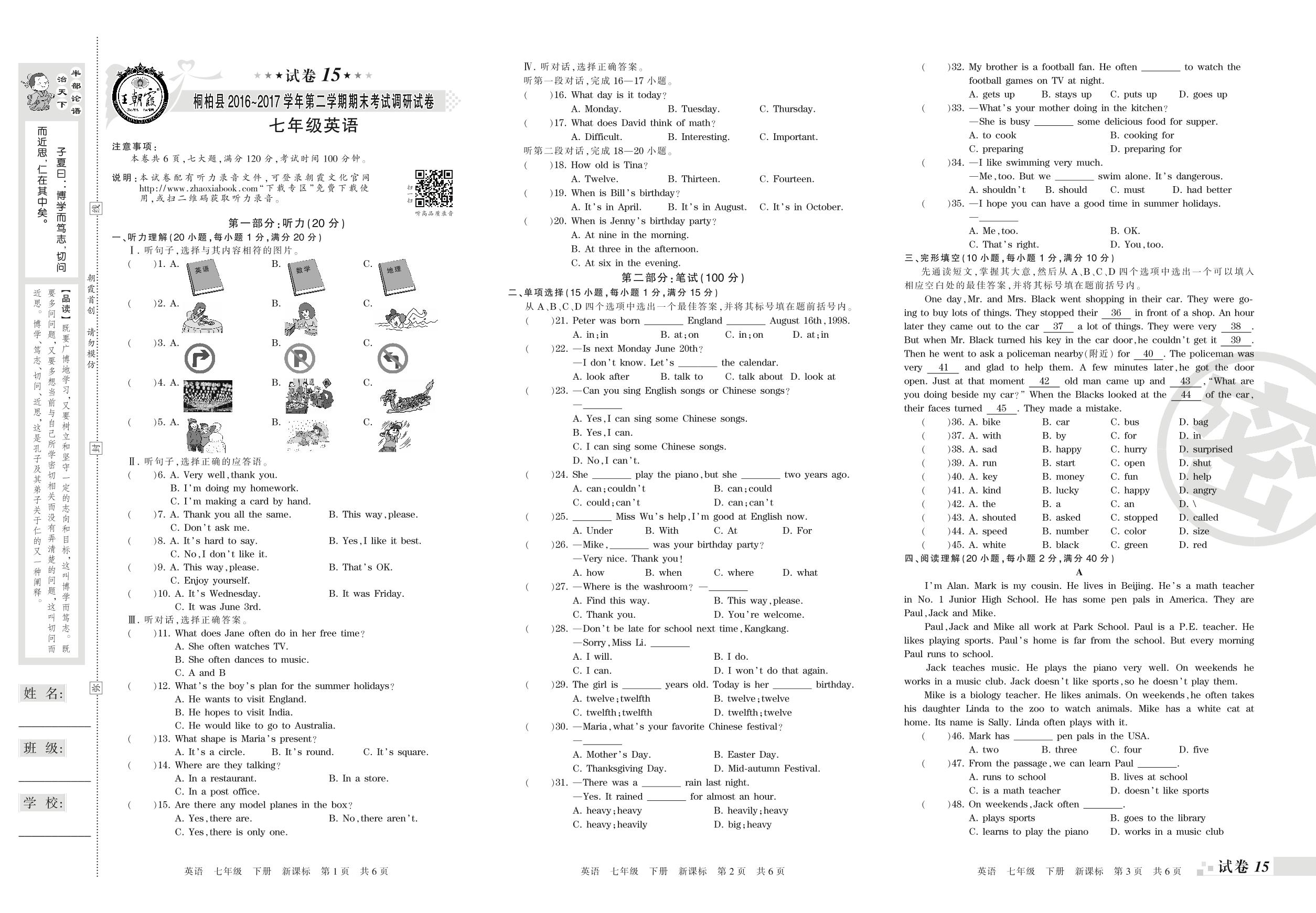 2016-2017学年第二学期南阳市桐柏县七年级英语试卷(新课版)【15】