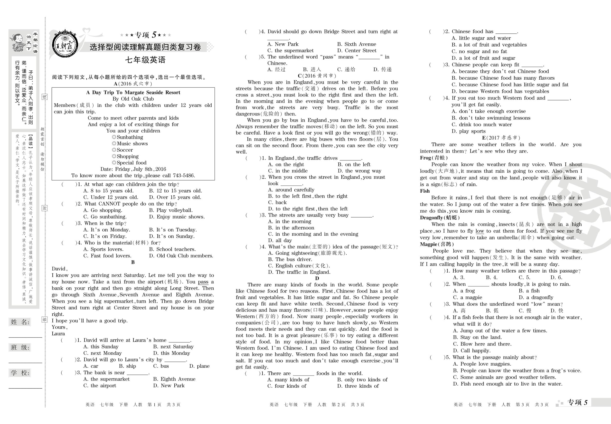 王朝霞期末专项卷——选择型阅读、任务型阅读真题归类复习卷七年级下册英语(人教版)【0】