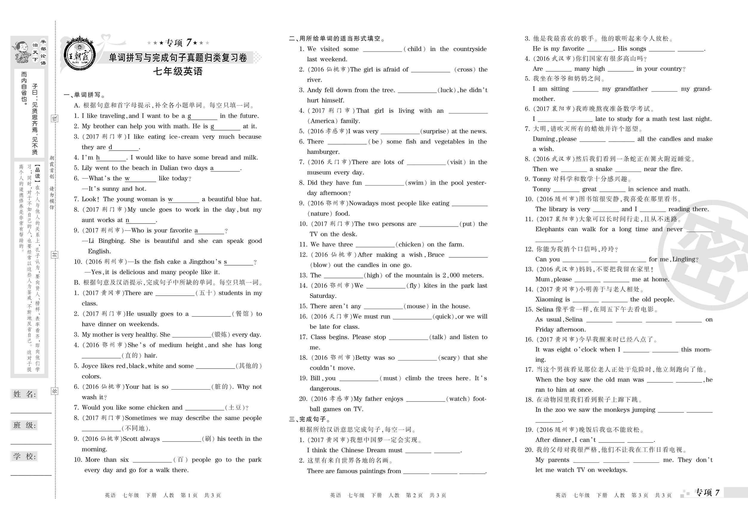 王朝霞期末专项卷——单词拼写与完成句子、情景交际真题归类复习卷七年级下册英语(人教版)【0】