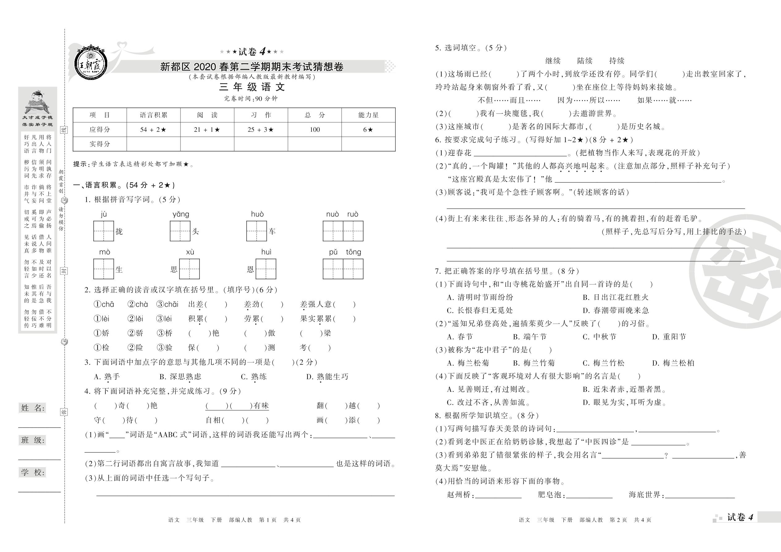 2018-2019学年第二学期成都市新都区猜想卷三年级语文试卷(人教版)【4】