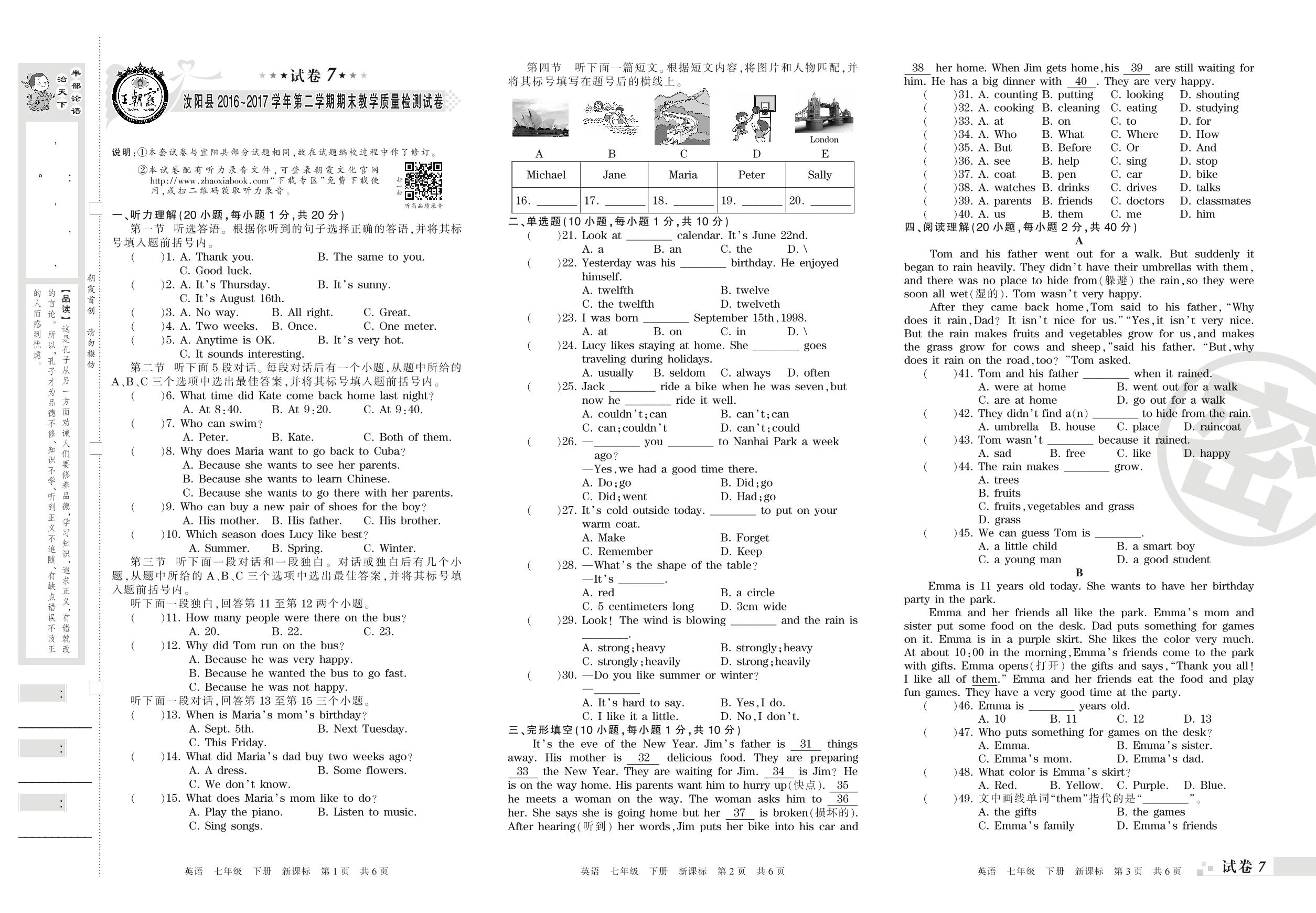 2016-2017学年第二学期洛阳市汝阳县七年级英语试卷(新课版)【7】