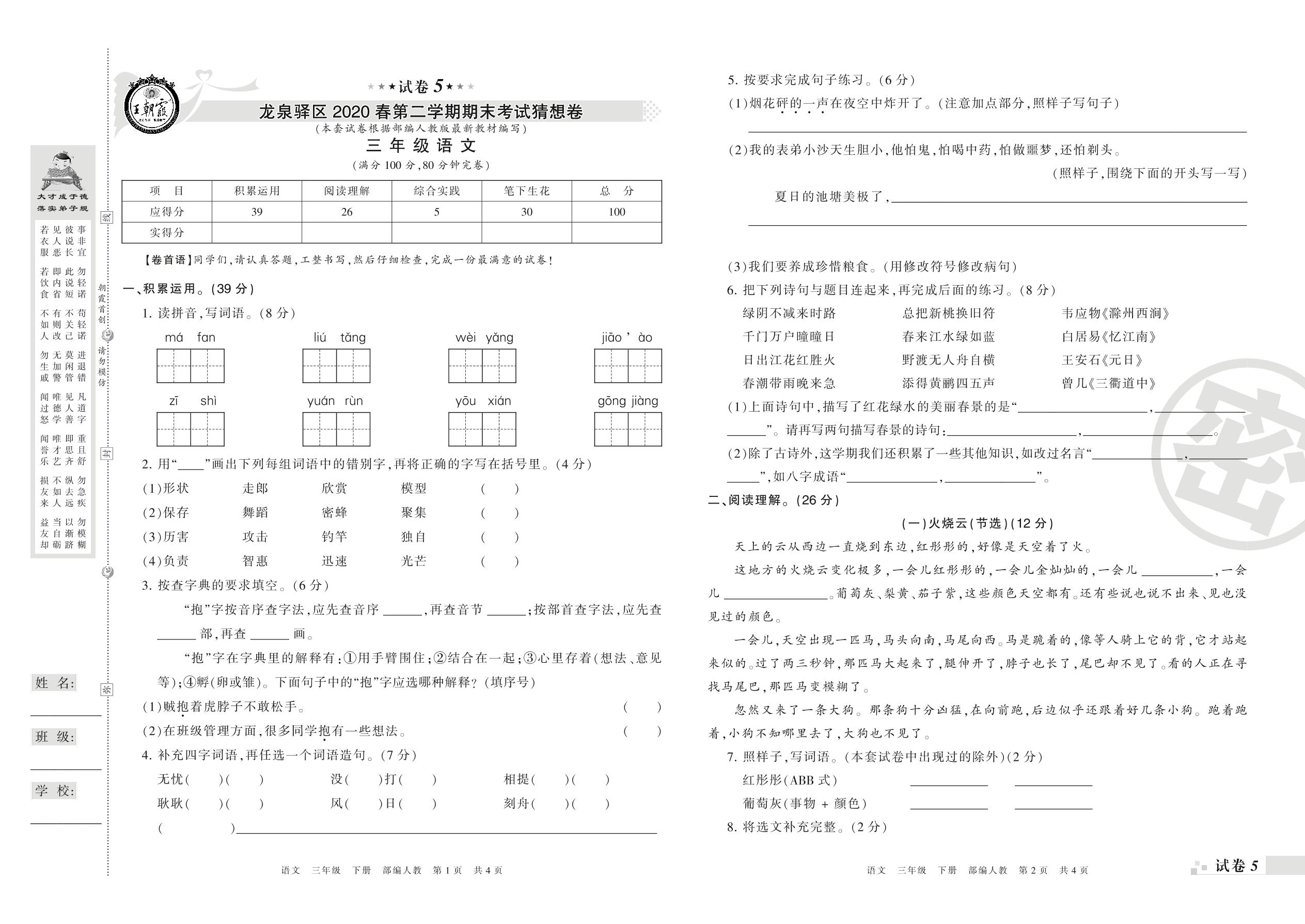 2018-2019学年第二学期成都市龙泉驿区猜想卷三年级语文试卷(人教版)【5】