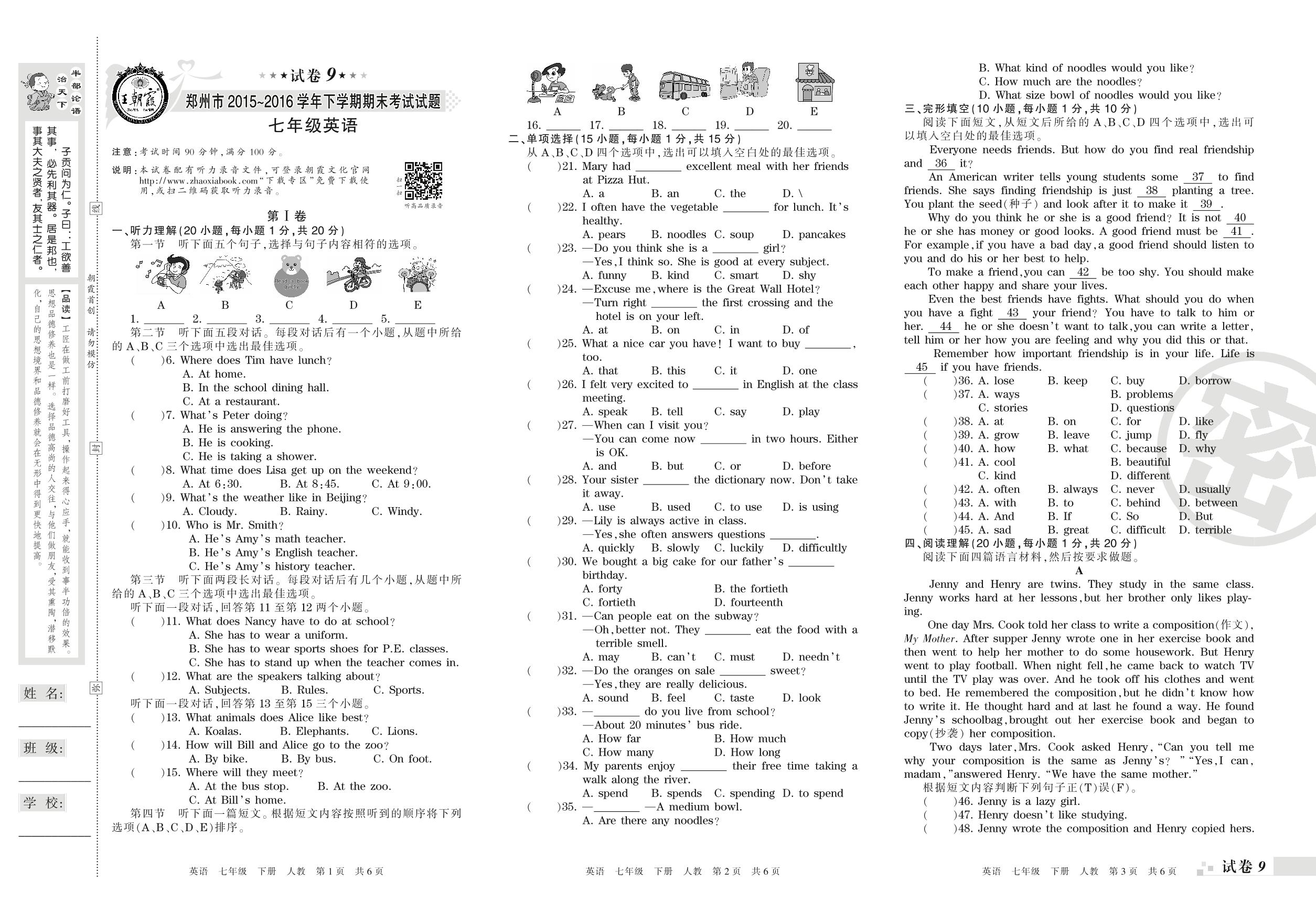 2015-2016学年第二学期郑州市七年级英语试卷(人教版)【9】