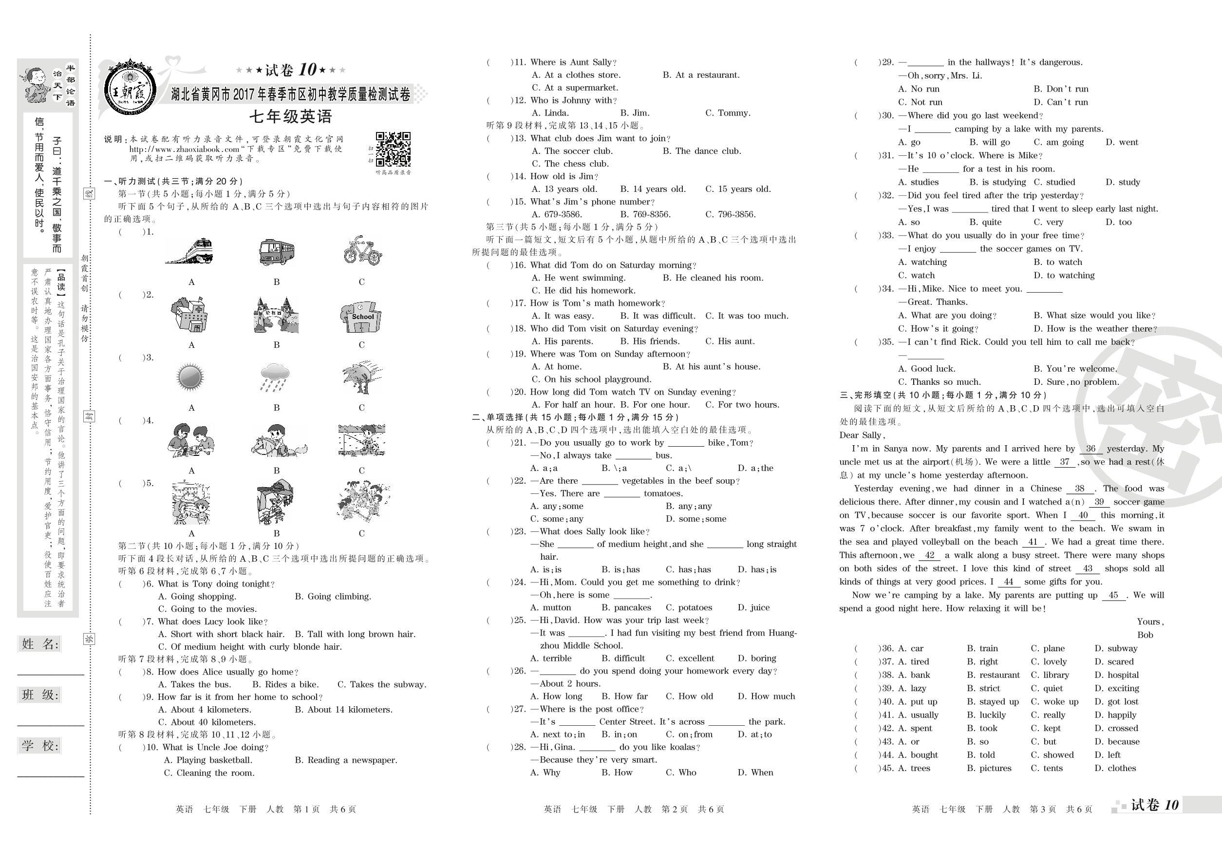 2016-2017学年第二学期湖北省黄冈市七年级英语试卷(人教版)_R220123142324003【10】