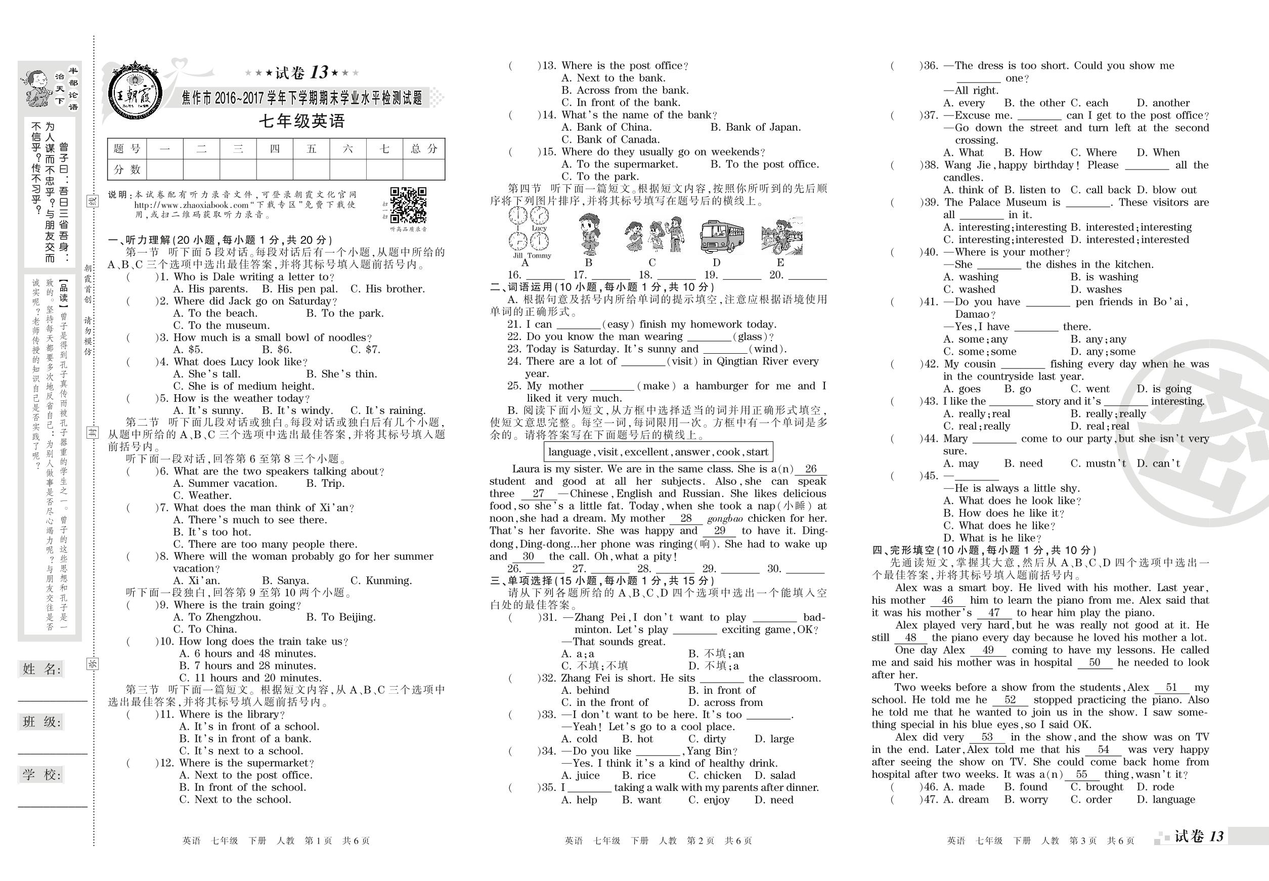 2016-2017学年第二学期焦作市七年级英语试卷(人教版)【13】