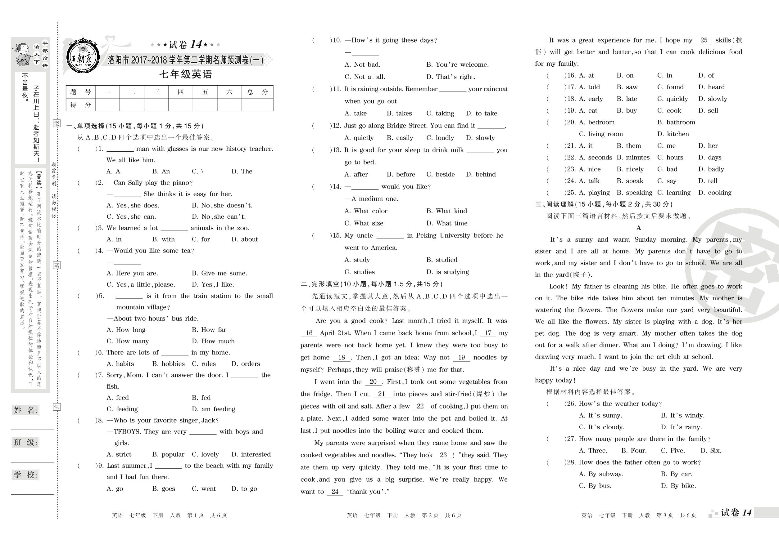 2017-2018学年第二学期洛阳市预测卷(一)七年级英语(人教版)【14】
