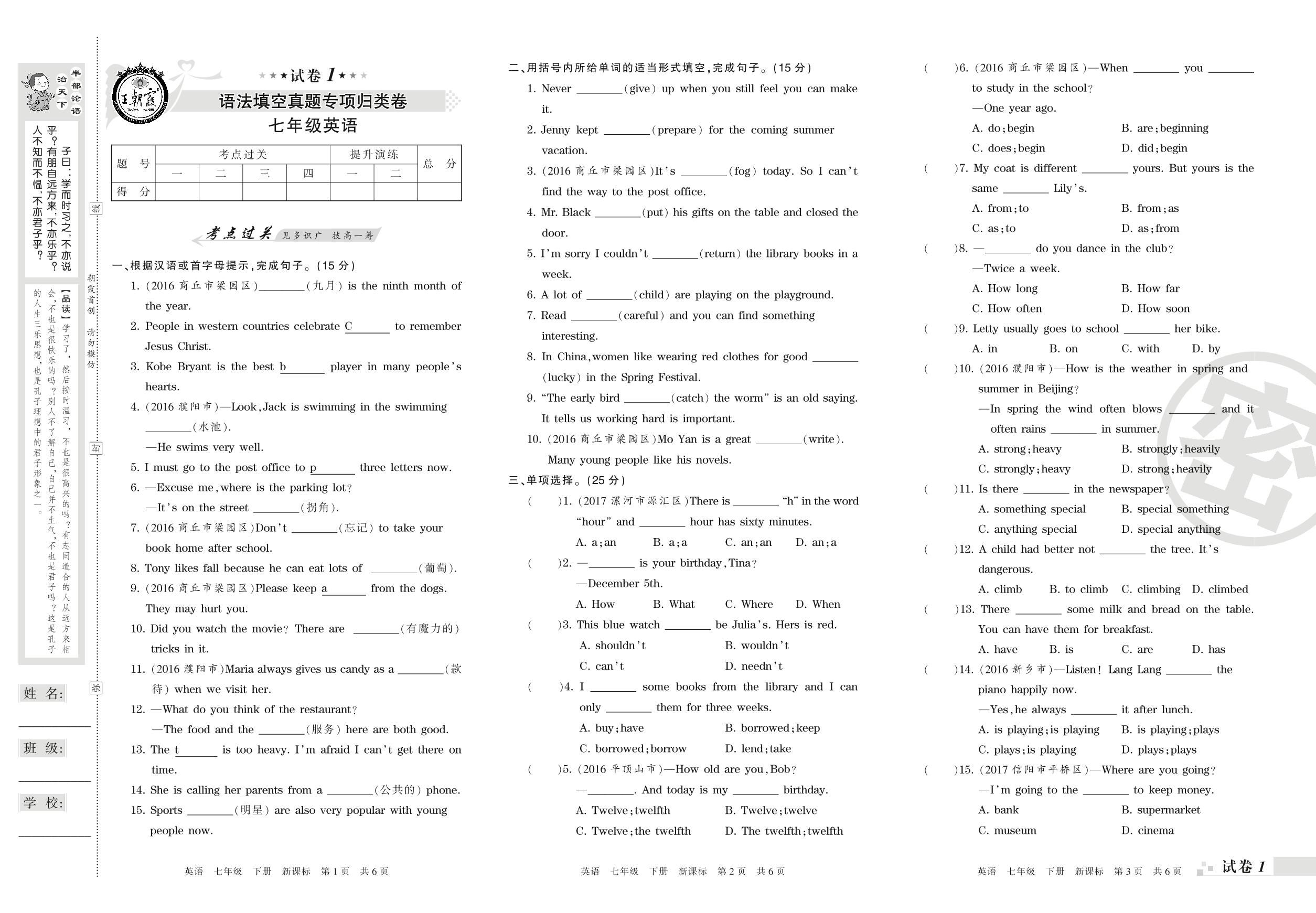 王朝霞期末专项卷——语法填空真题专项归类卷七年级下册英语(新课版)_R220123142658304【1】