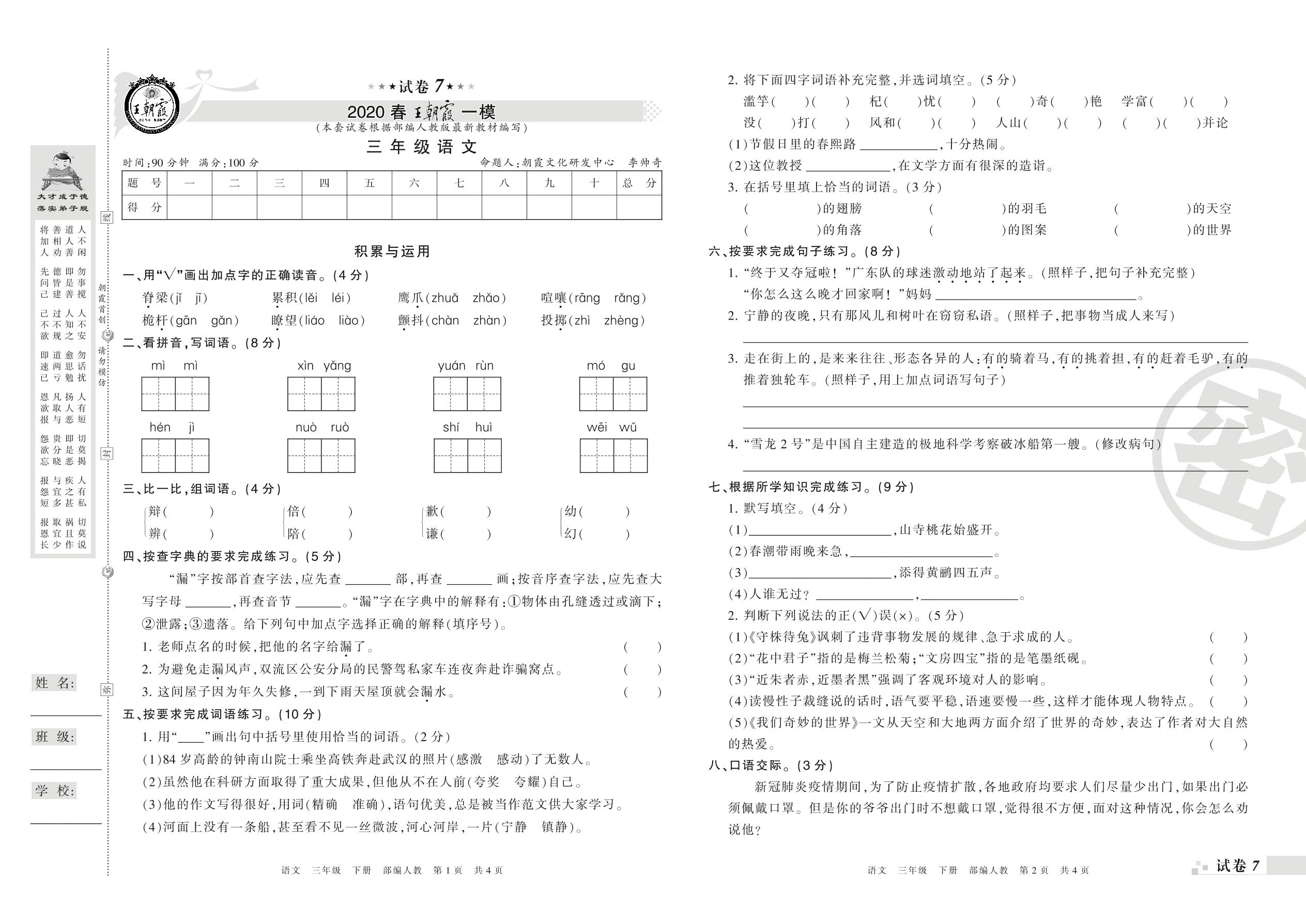 王朝霞期末模拟卷三年级下册语文(人教版)_R21080190632【7】