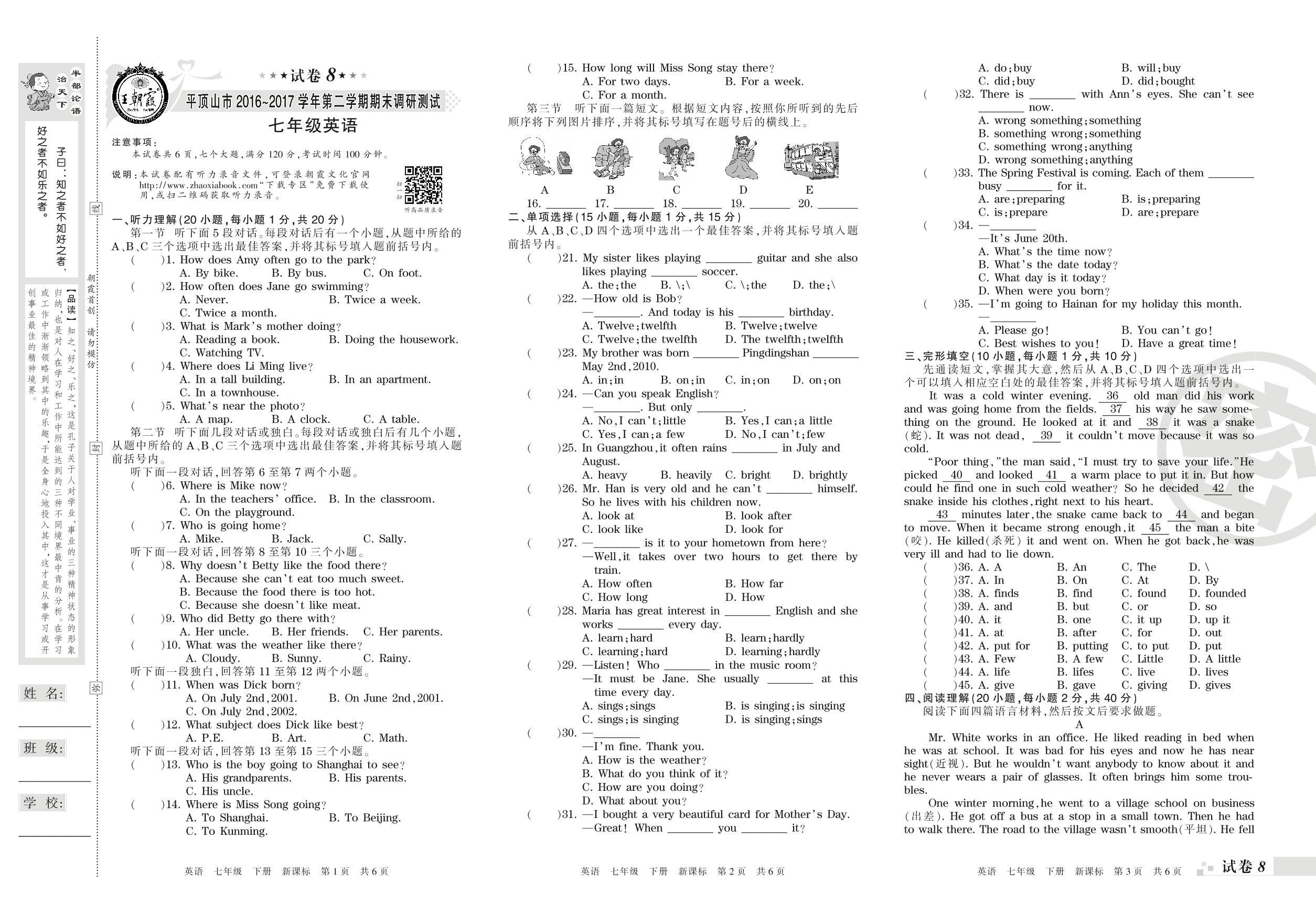 2016-2017学年第二学期平顶山市七年级英语试卷(新课版)【8】
