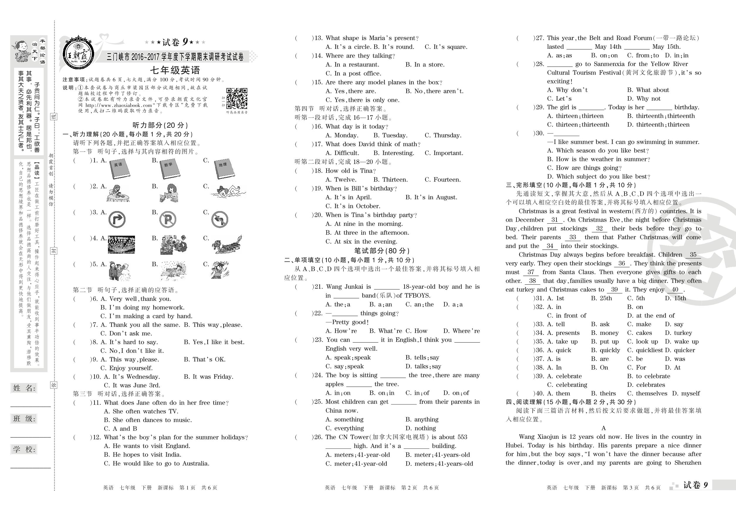 2016-2017学年第二学期三门峡市七年级英语试卷(新课版)【9】