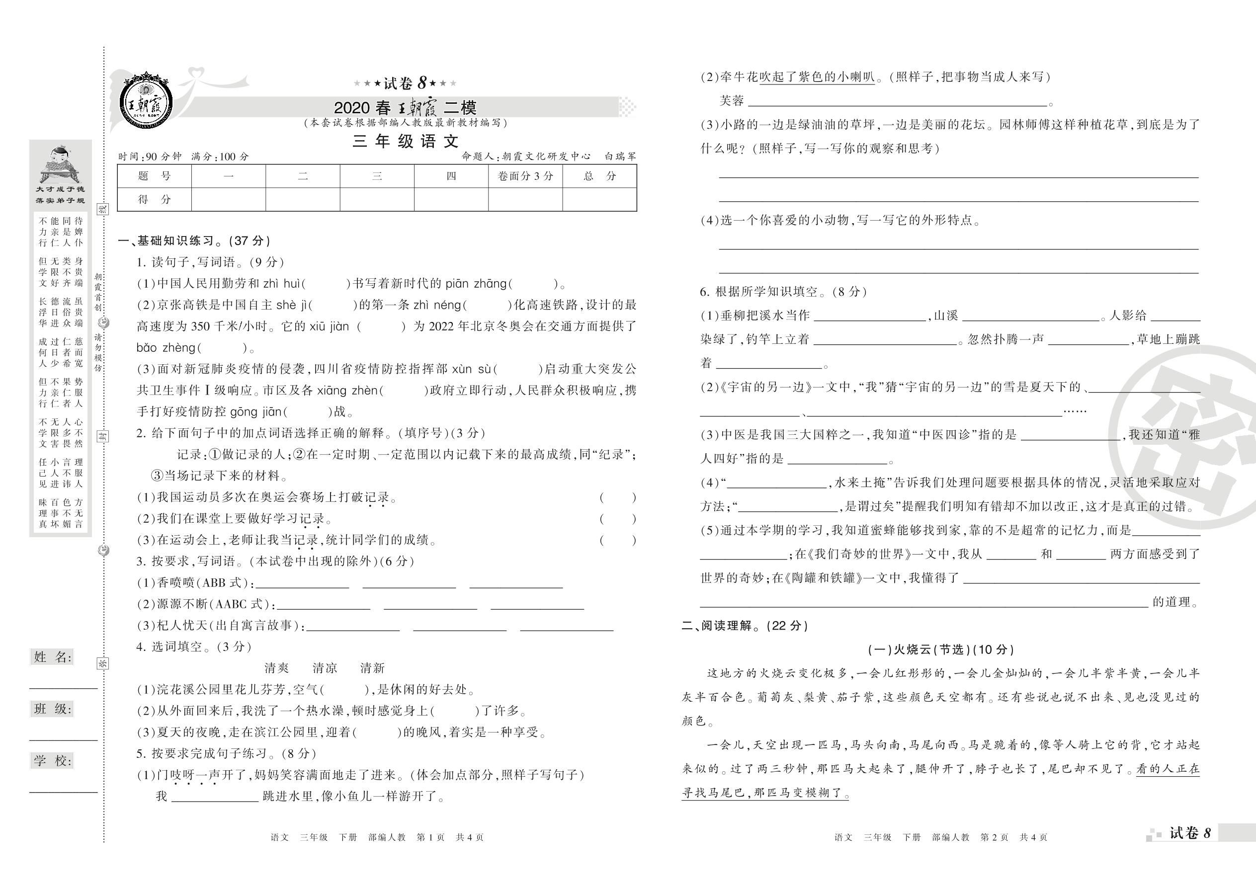 王朝霞期末模拟卷三年级下册语文(人教版)_R21080190637【8】