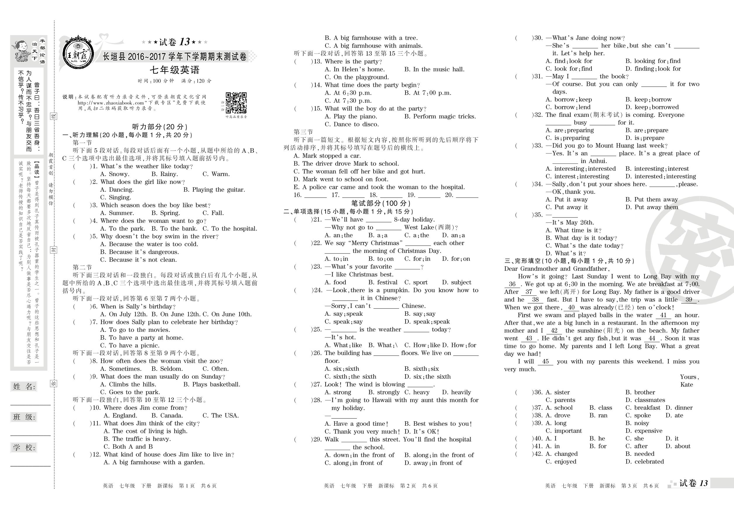 2016-2017学年第二学期新乡市长垣县七年级英语试卷(新课版)【13】