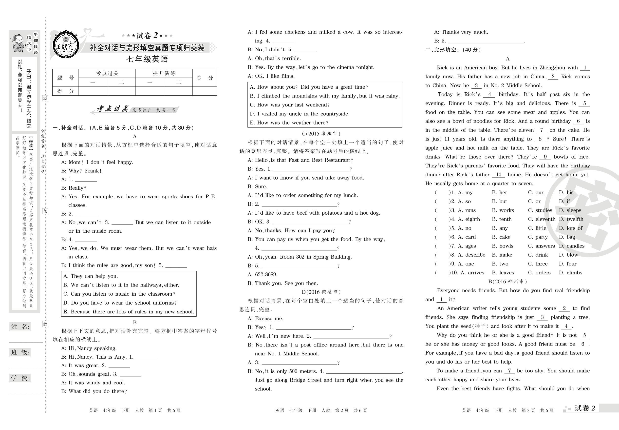 王朝霞期末专项卷——补全对话与完形填空真题专项归类卷七年级下册英语(人教版)【2】