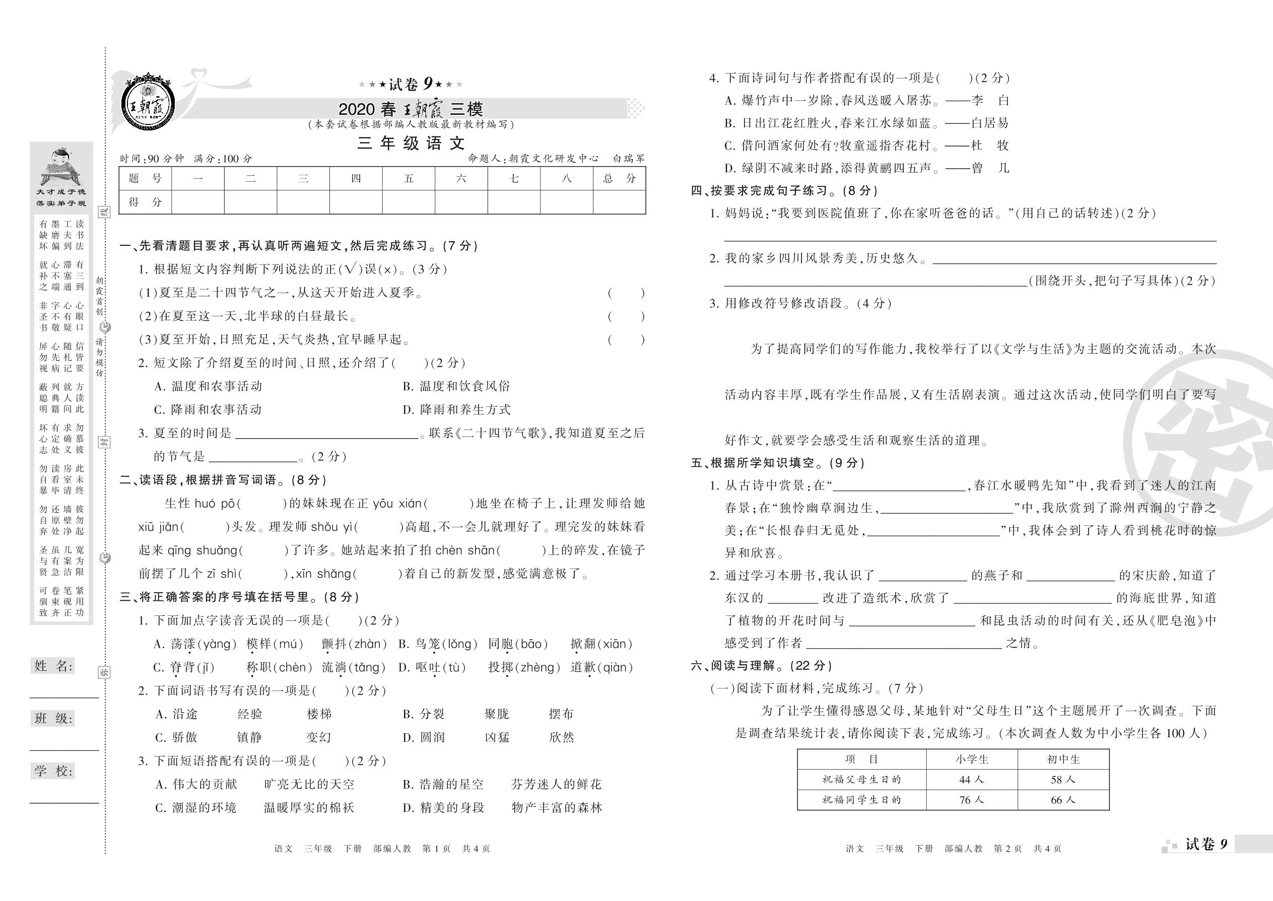 王朝霞期末模拟卷三年级下册语文(人教版)_R21080190642【9】
