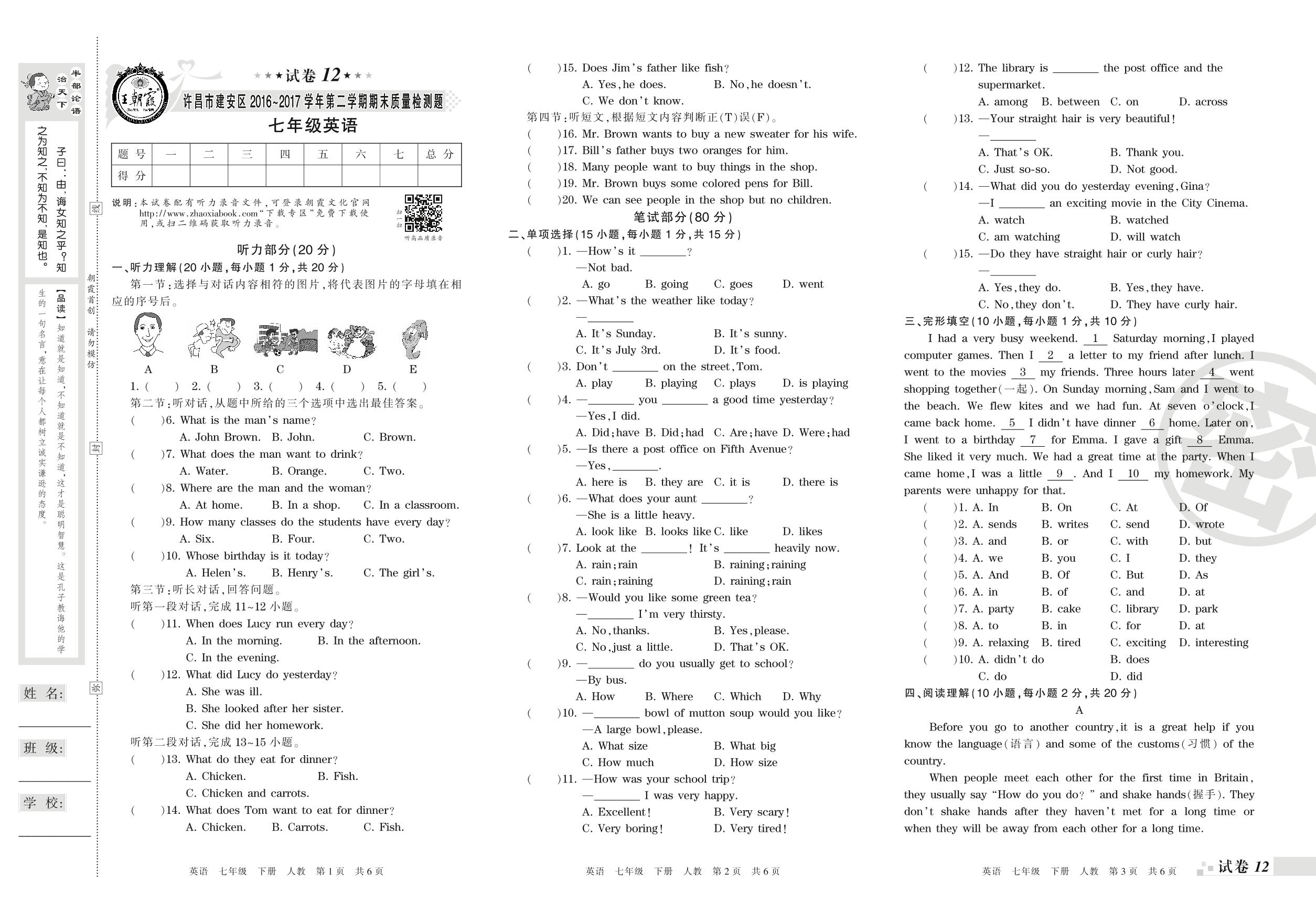 2016-2017学年第二学期许昌市建安区七年级英语试卷(人教版)【12】