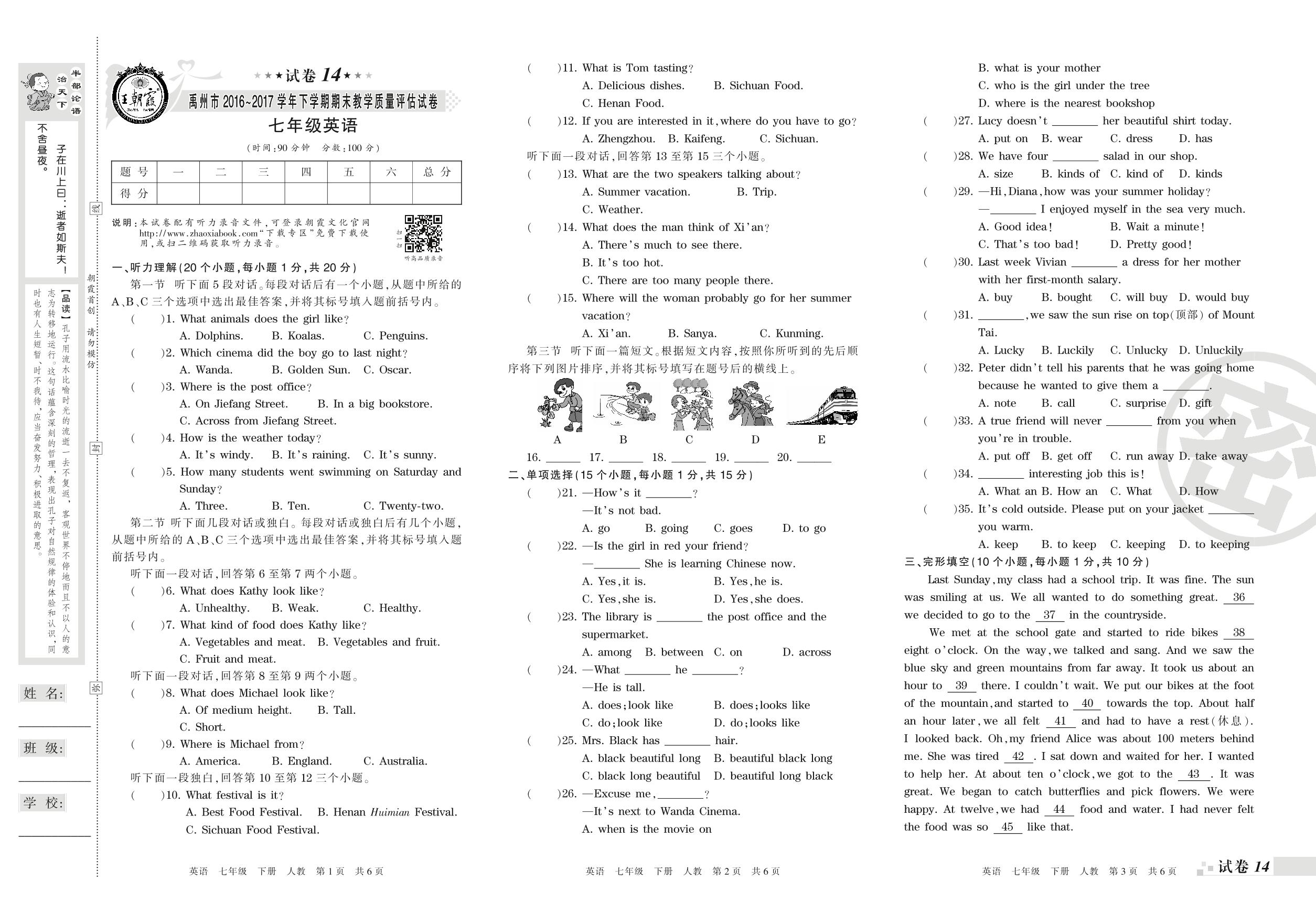 2016-2017学年第二学期禹州市七年级英语试卷(人教版)【14】