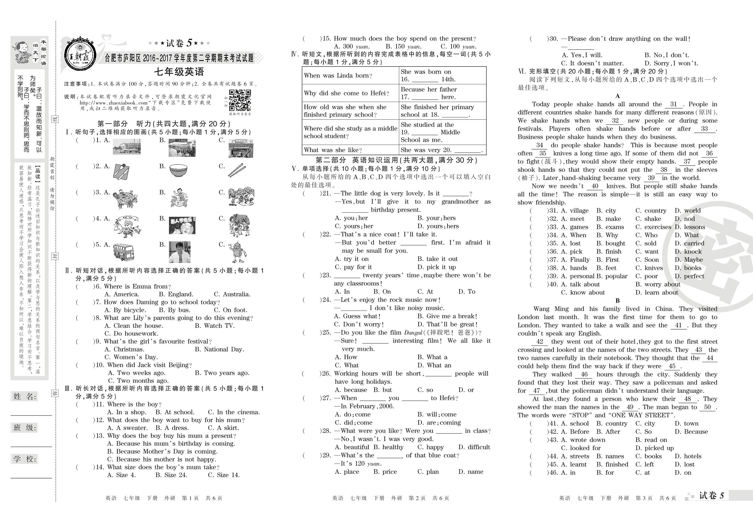 2016-2017学年第二学期合肥市庐阳区七年级英语试卷(外研版)【5】