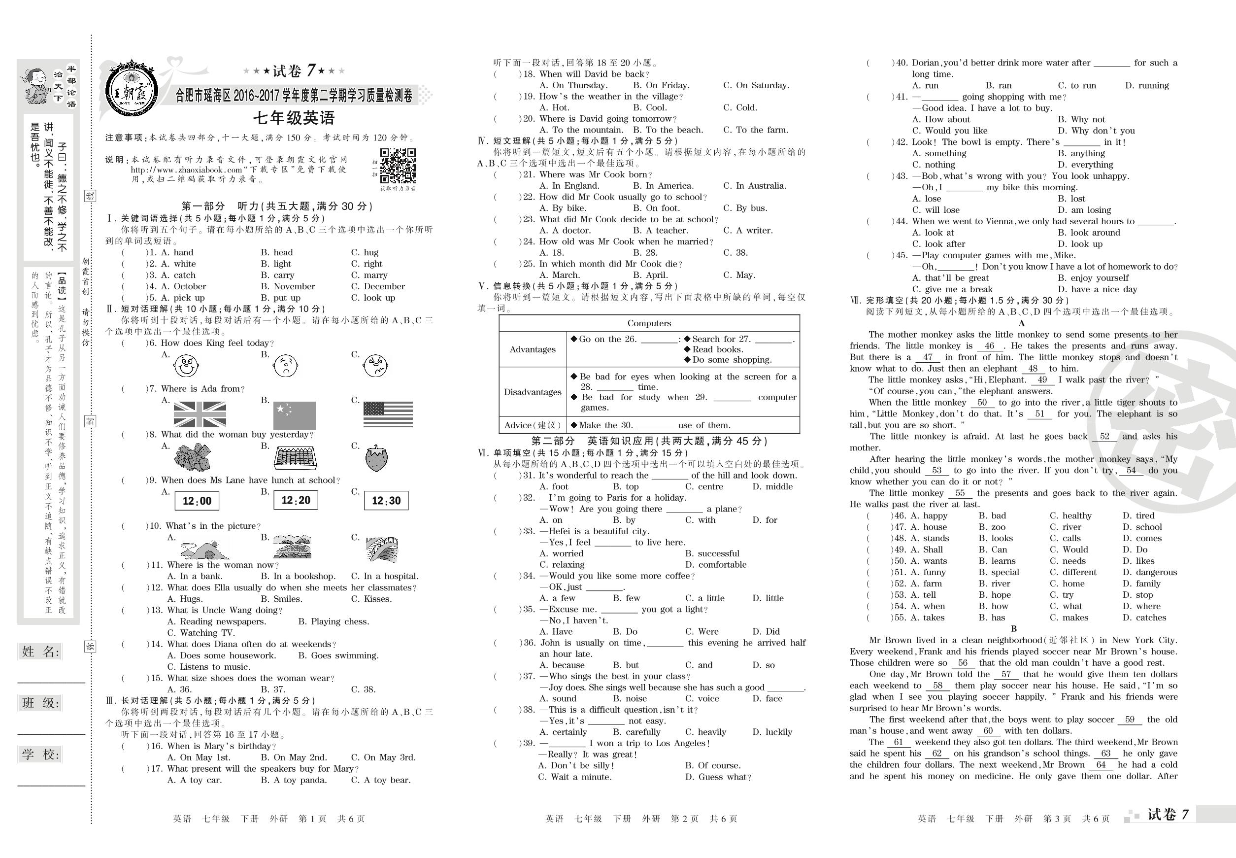 2016-2017学年第二学期合肥市瑶海区七年级英语试卷(外研版)【7】