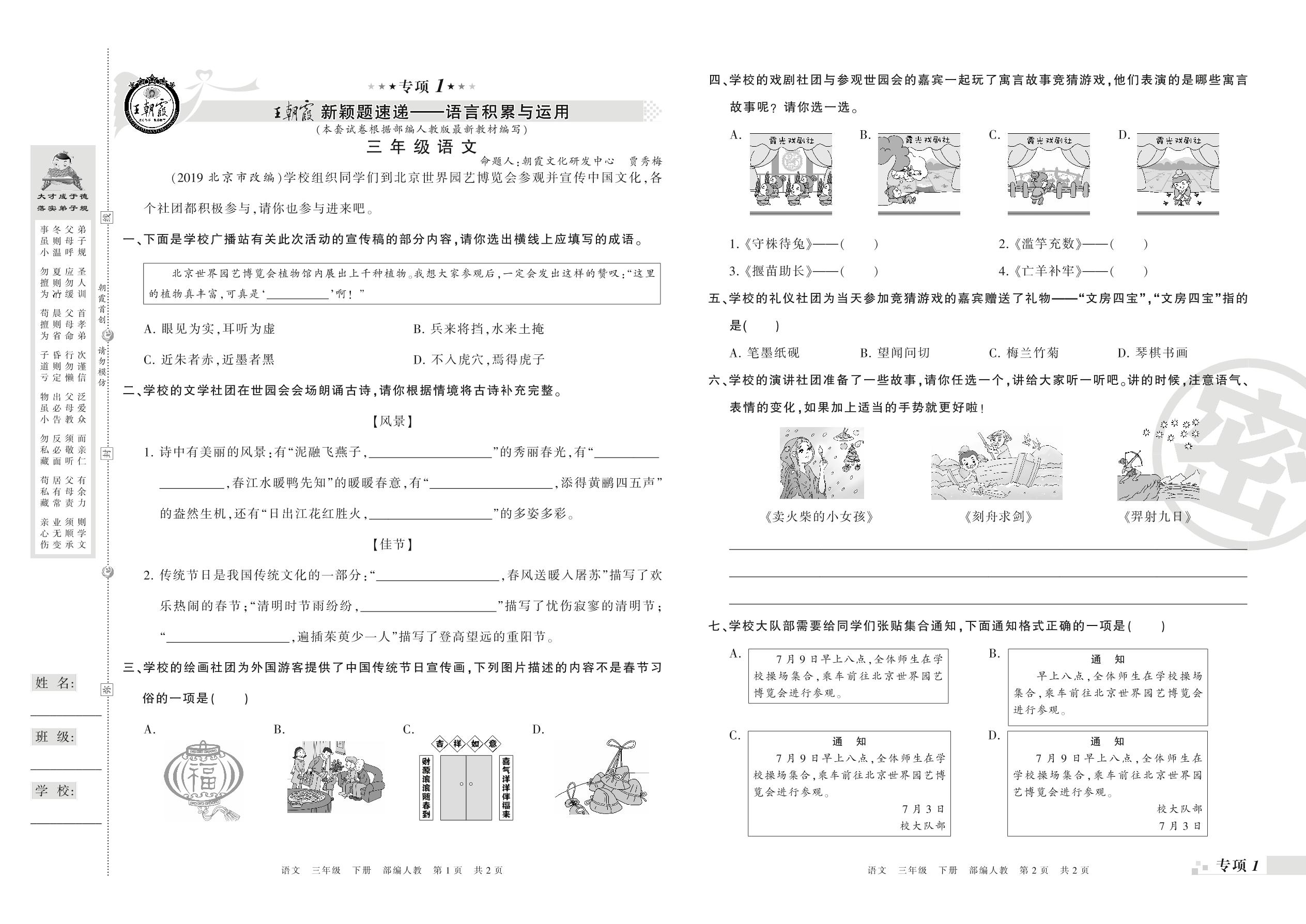 王朝霞期末专项卷——新颖题速递:语言积累与运用、非连续性文本阅读三年级下册语文(人教版)_R21080190653【0】