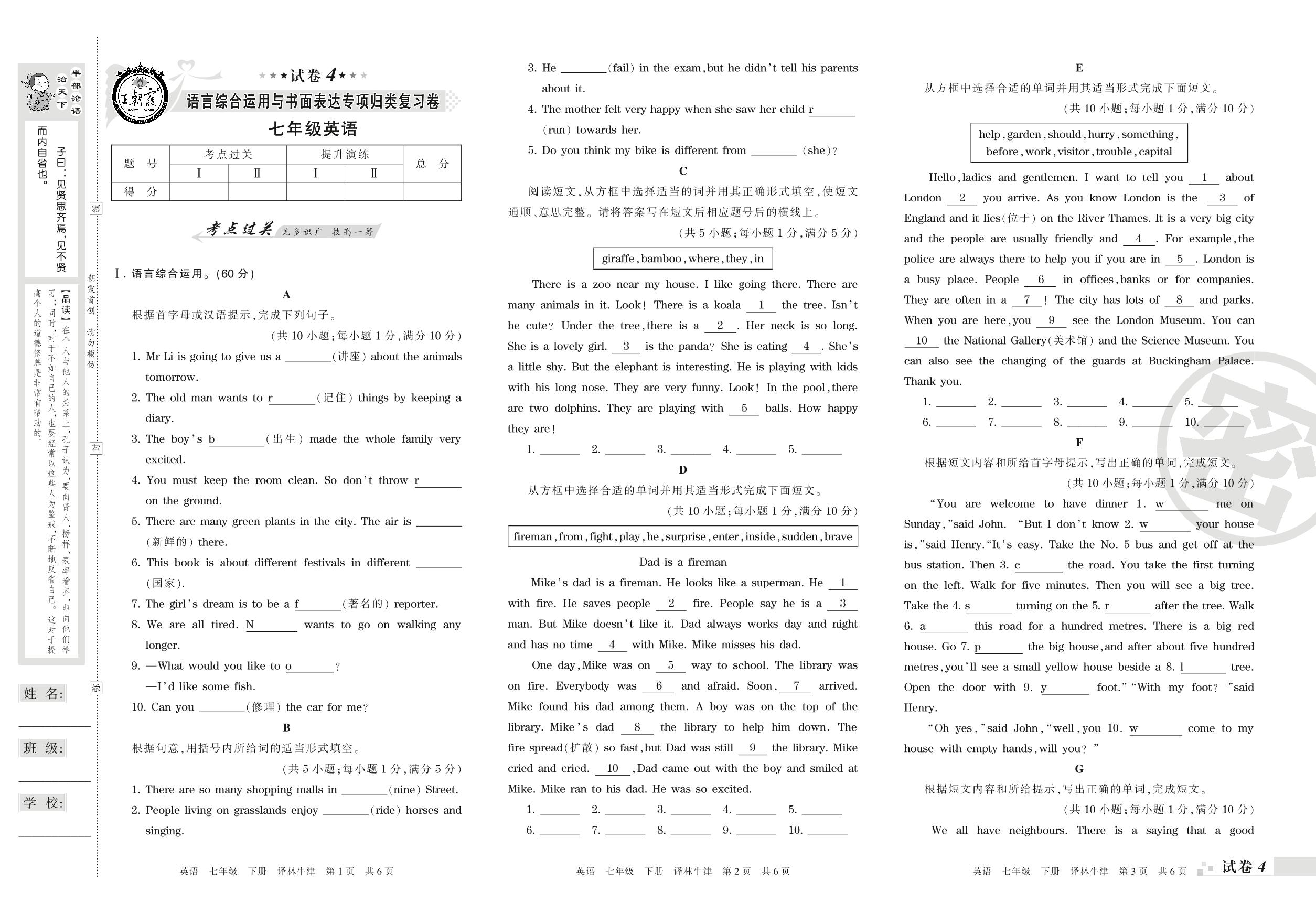王朝霞期末专项卷——语言综合运用与书面表达专项归类复习卷七年级下册英语(译林版)【4】