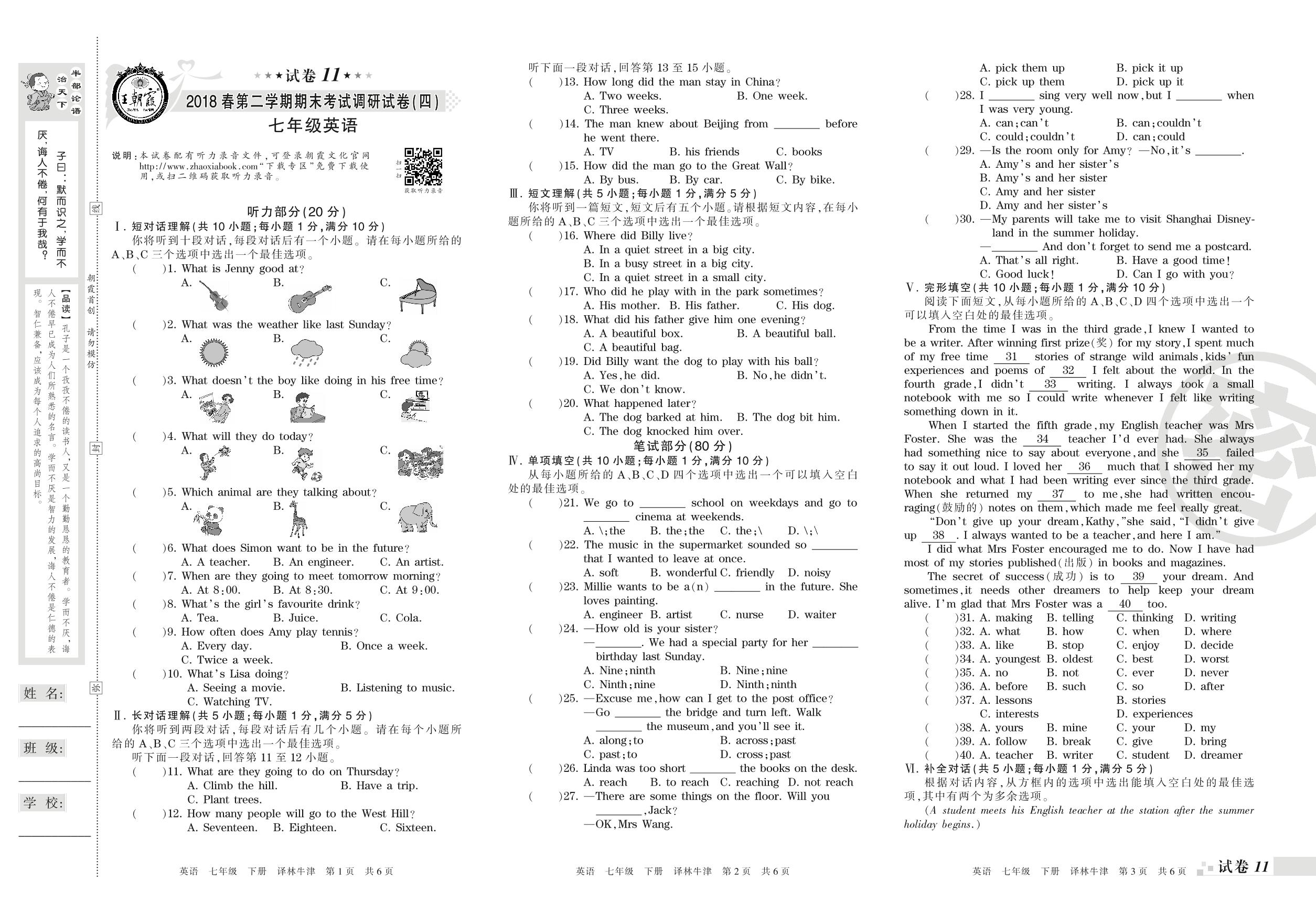 七年级英语译林版(译林牛津版)下册期末卷