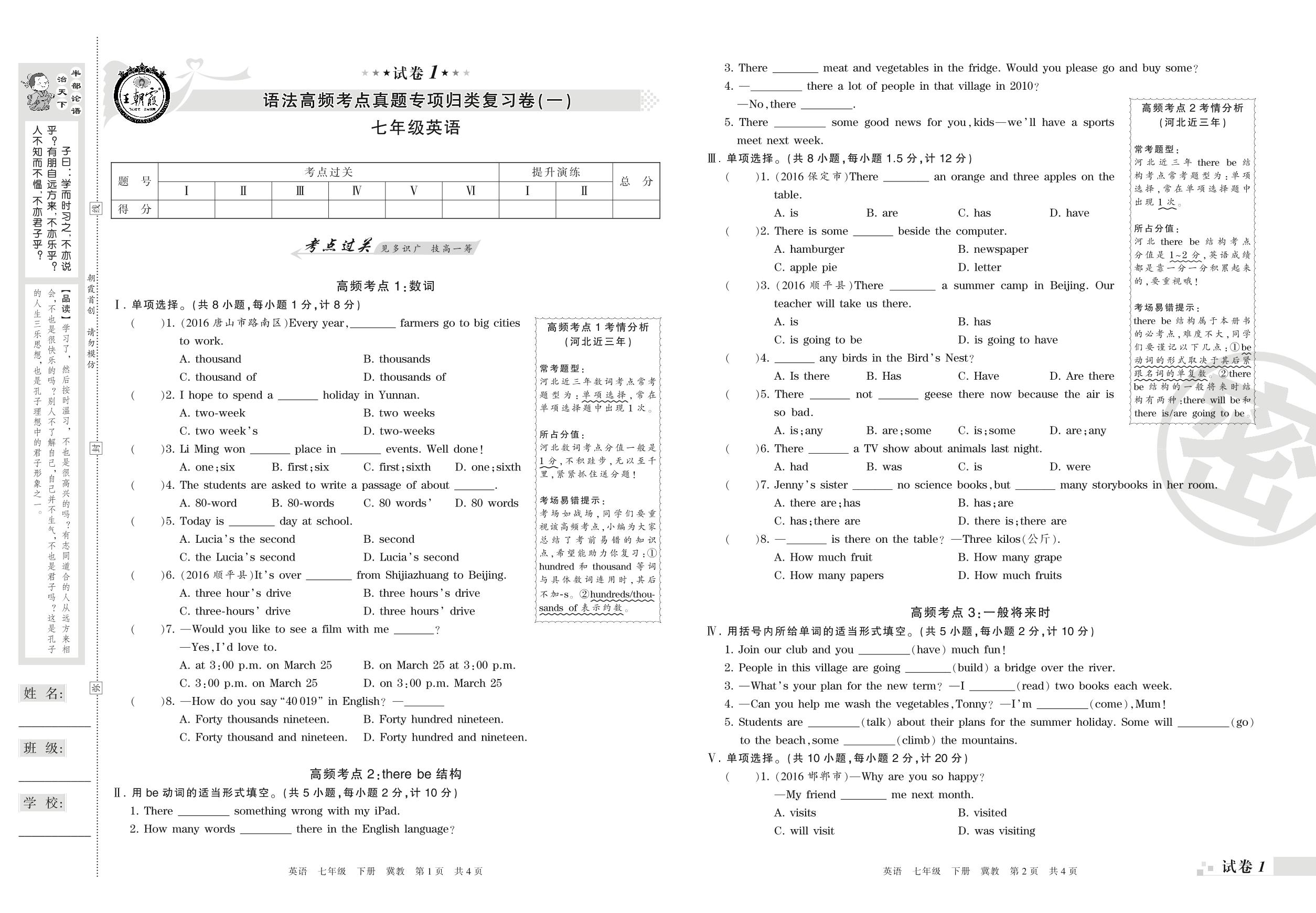 王朝霞期末专项卷——语法高频考点真题专项归类复习卷(一)七年级下册英语(冀教版)【1】