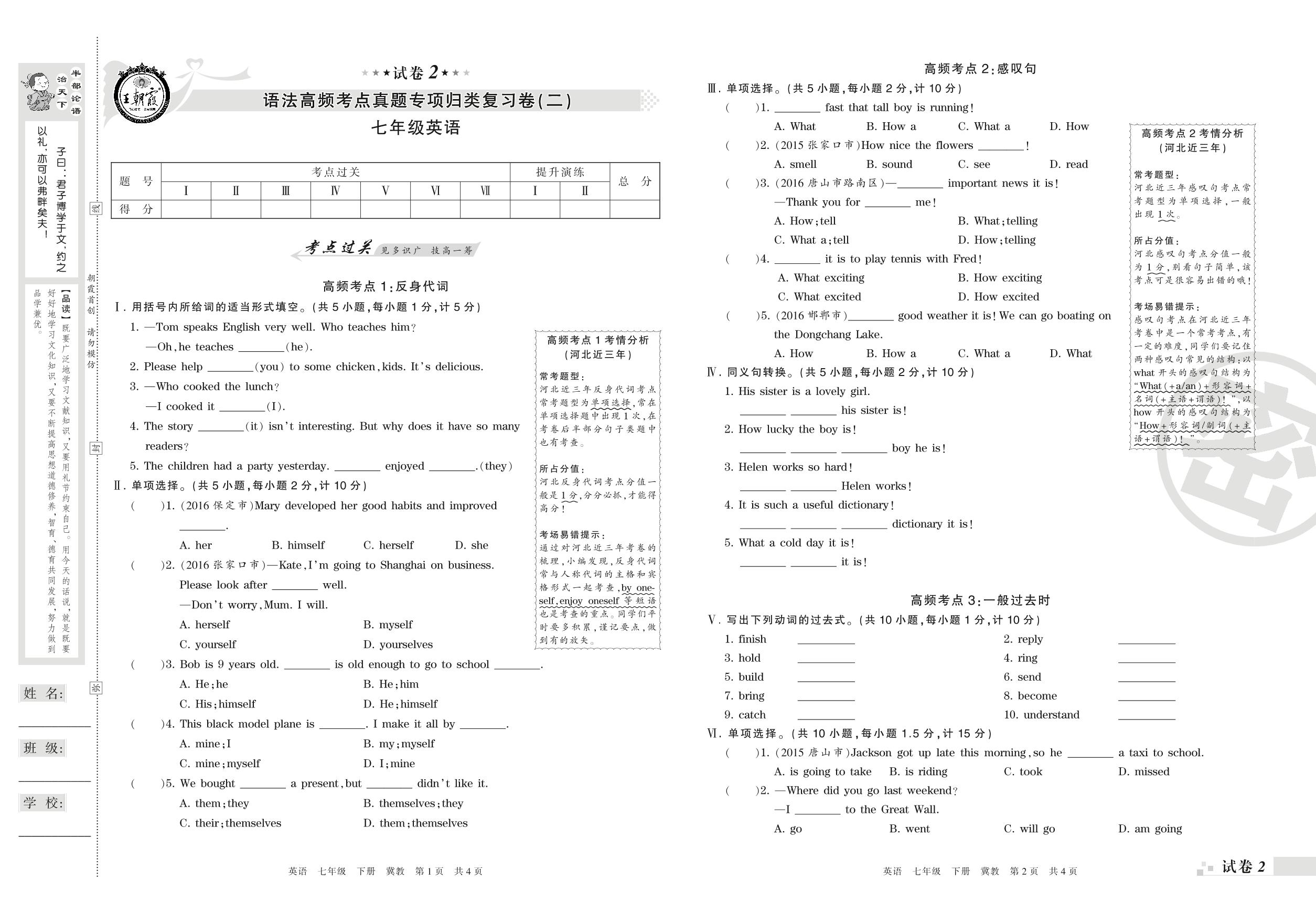 王朝霞期末专项卷——语法高频考点真题专项归类复习卷(二)七年级下册英语(冀教版)【2】