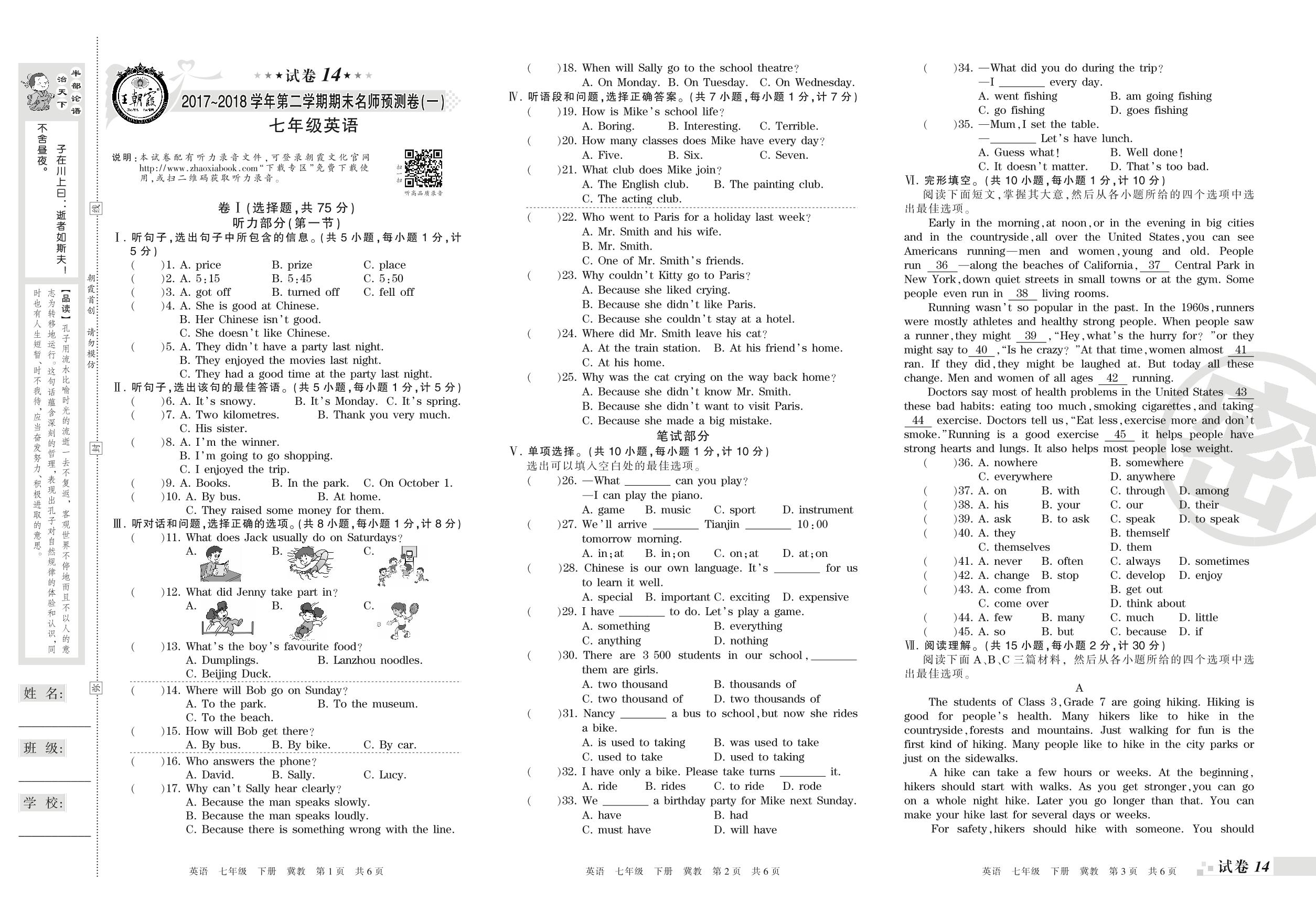 2017-2018学年第二学期期末预测卷(一)七年级英语(冀教版)【14】