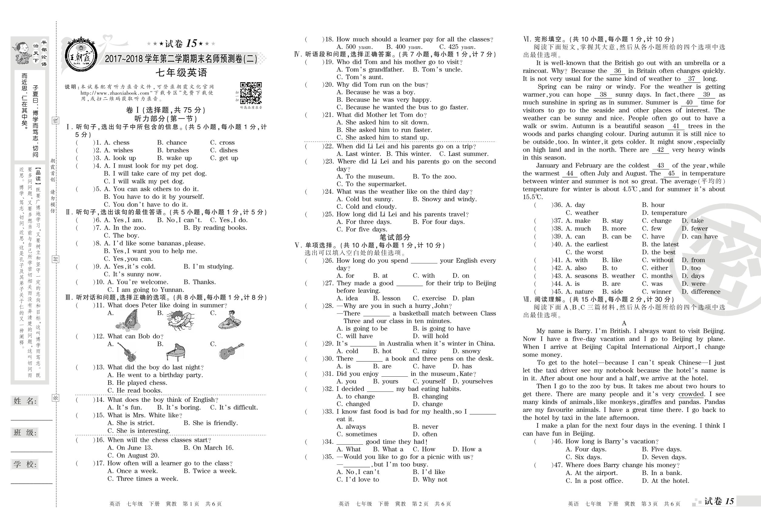2017-2018学年第二学期期末预测卷(二)七年级英语(冀教版)【15】