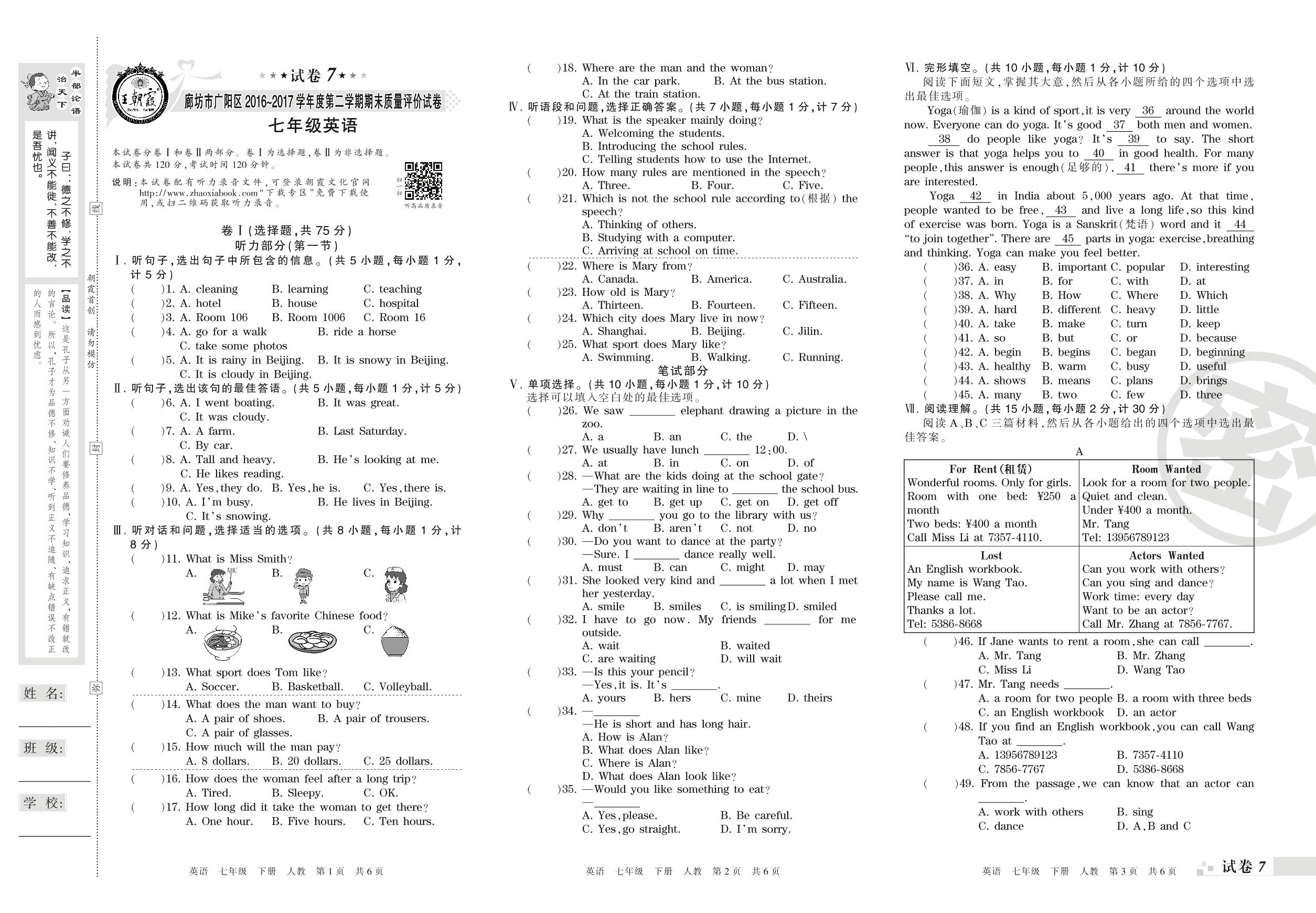 2016-2017学年第二学期廊坊市广阳区七年级英语试卷(人教版)【7】